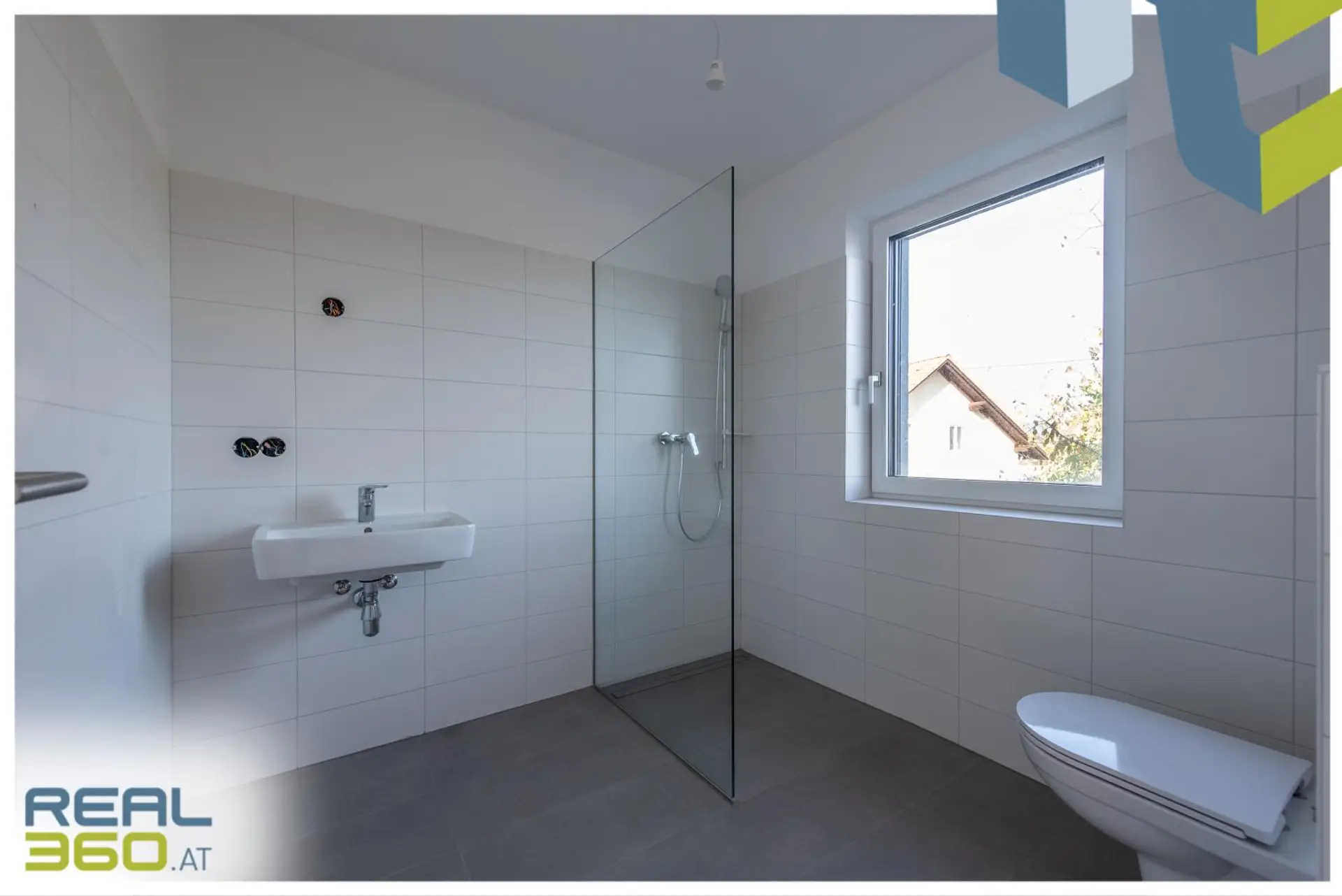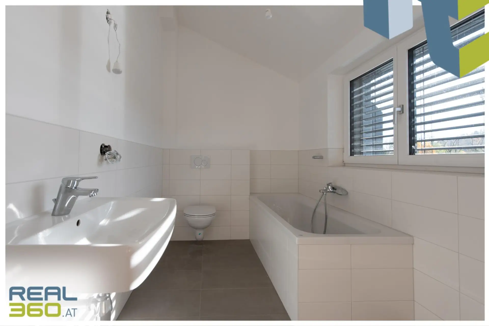 - Tageslicht-Bad mit Dusche, Badewanne, Handwaschbecken, WM-Anschluss und WC