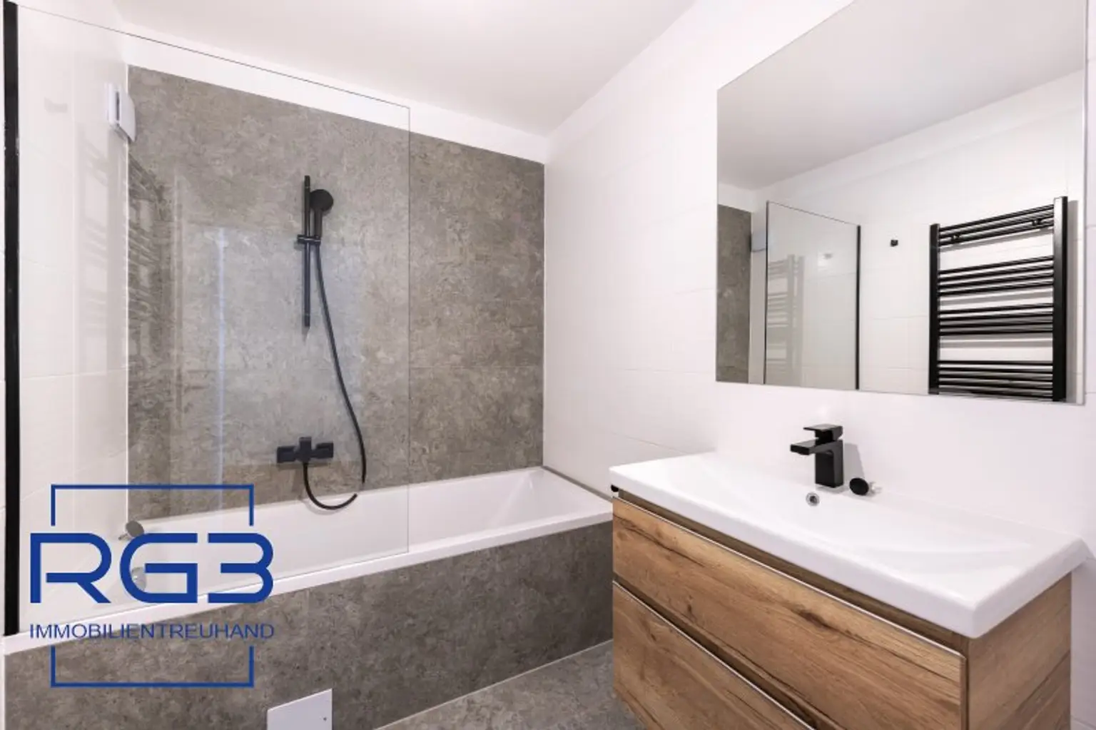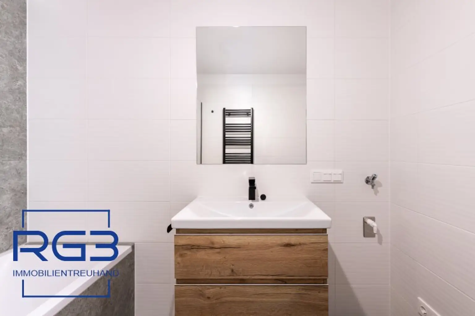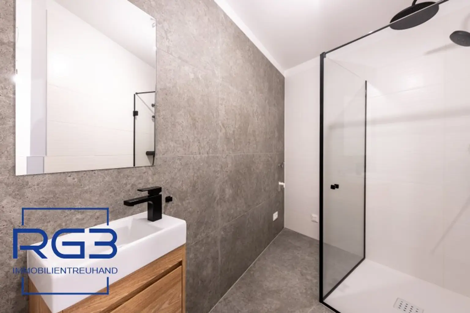 Mit dem Lift fahren Sie bequem in den ersten Stock. Sie betreten die Wohnung und spüren sofort: alles ist neu, alles ist ruhig, alles passt zusammen. Rechts befindet sich ausreichend Platz für Garderobe und Jacken. Links liegt das moderne Badezimmer mit extra Toilette, klar gestaltet, hochwertig ausgeführt.