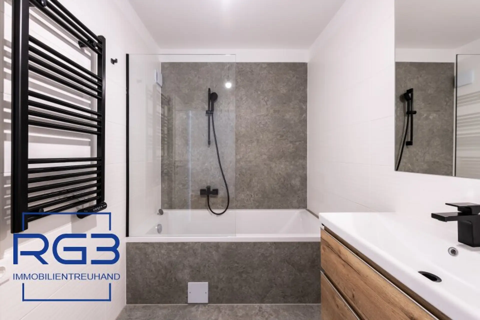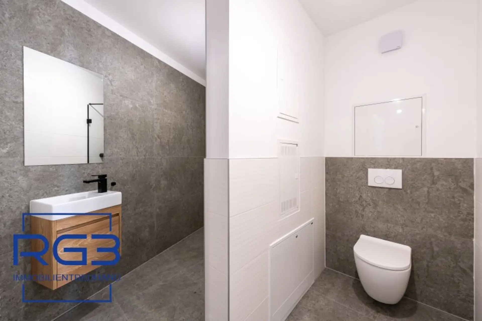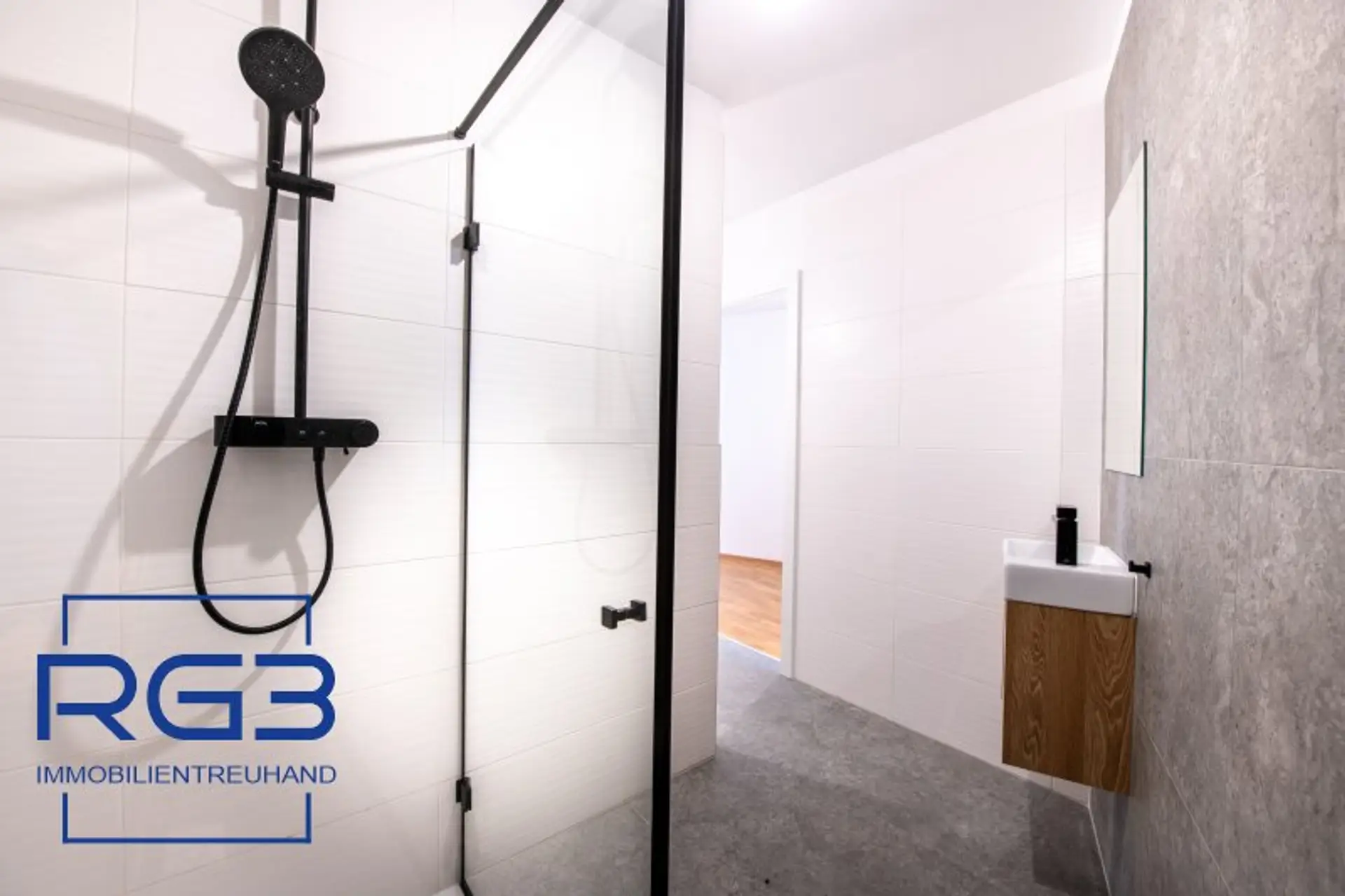 Mit dem Lift fahren Sie bequem in den ersten Stock. Sie betreten die Wohnung und spüren sofort: alles ist neu, alles ist ruhig, alles passt zusammen. Rechts befindet sich ausreichend Platz für Garderobe und Jacken. Links liegt das moderne Badezimmer mit extra Toilette, klar gestaltet, hochwertig ausgeführt.