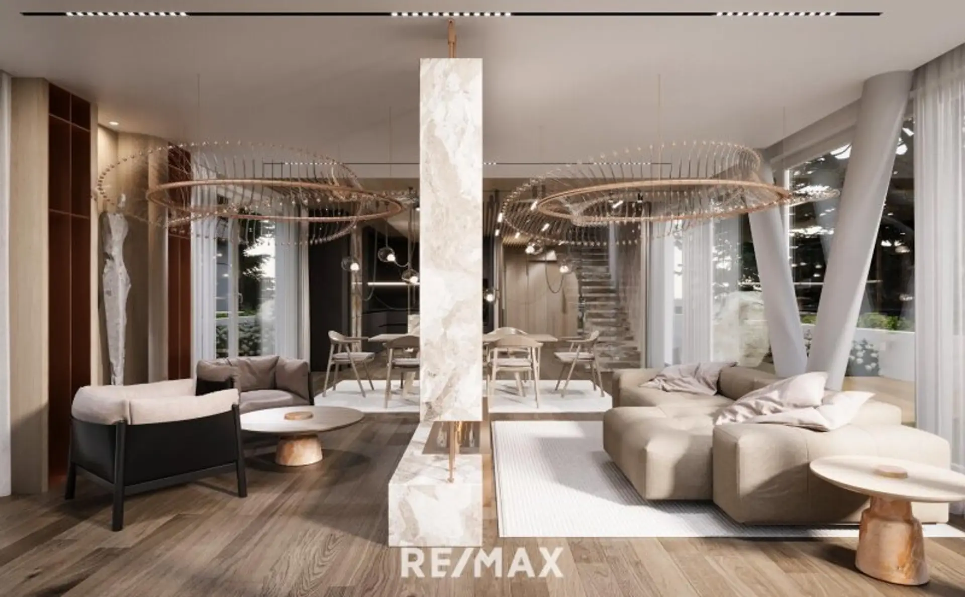 Die Architektur überzeugt durch klare Linien, offene Raumgestaltung und großzügige Glasflächen, die Innen- und Außenbereiche harmonisch miteinander verbinden. Hochwertige Materialien wie Glas, Holz und Naturstein prägen das elegante Gesamtbild.