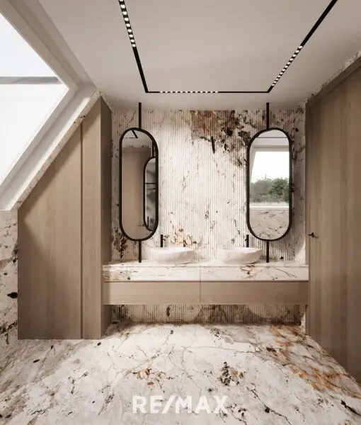 Das 1. Obergeschoß ist dem Familienleben gewidmet: Zwei Schlafzimmer, ein luxuriöses Bad, sowie das Masterbedroom mit Bad en suite, Schrankraum und privater Terrasse bieten höchsten Komfort und Privatsphäre.