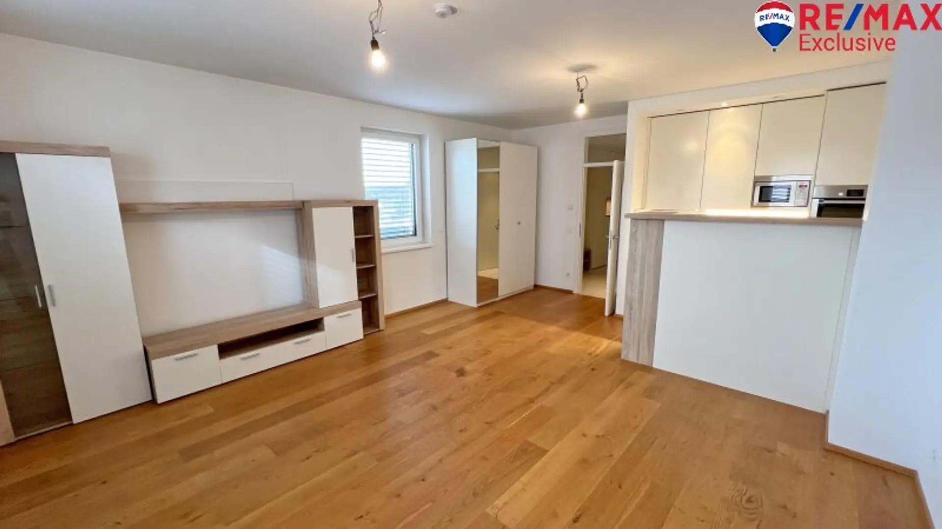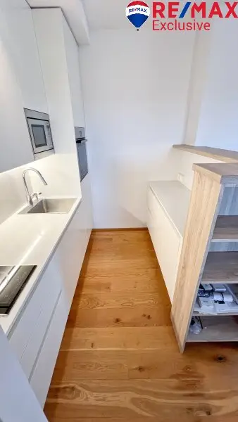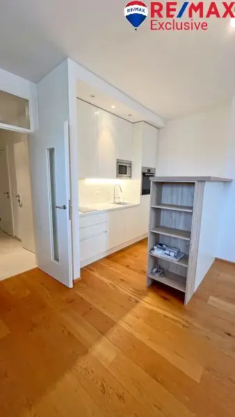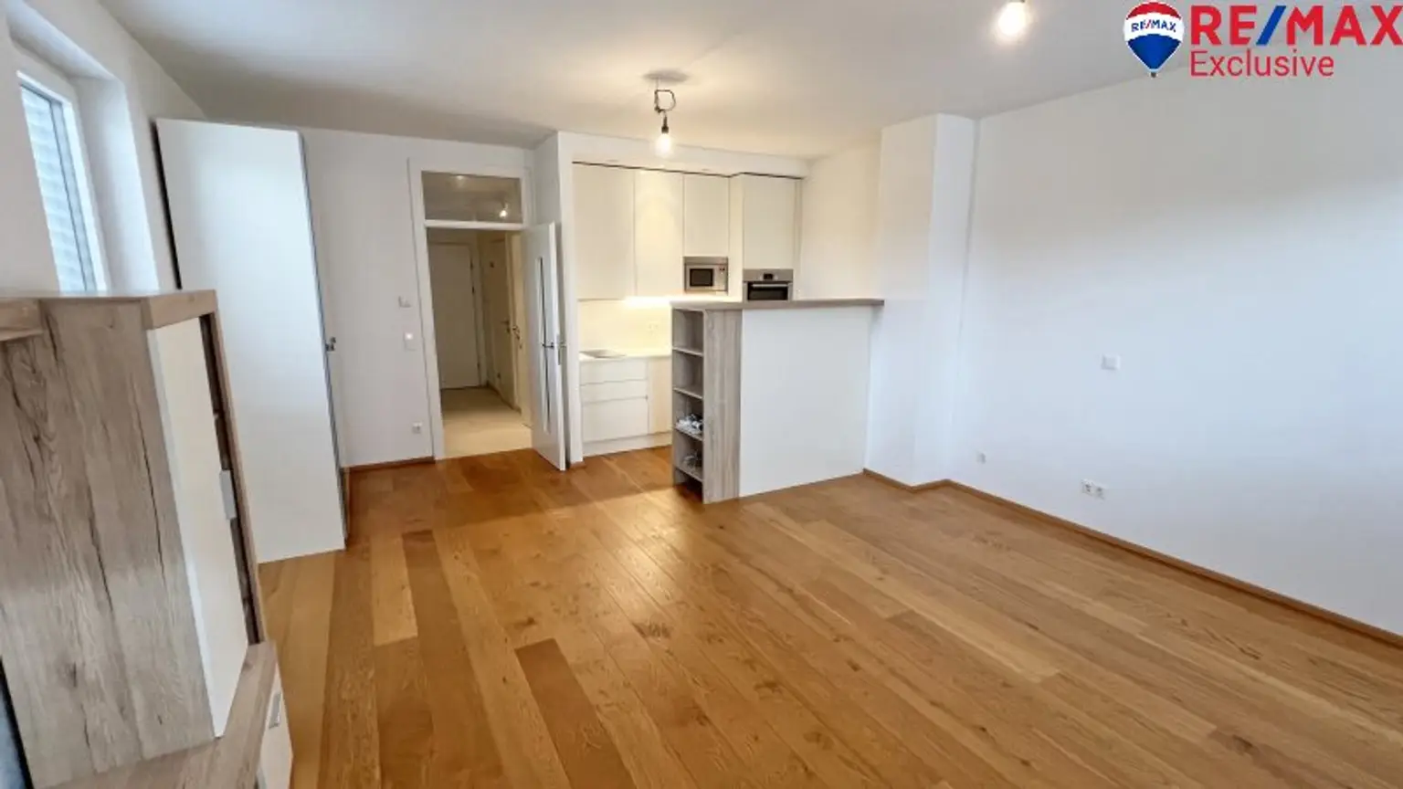 Die Wohnung besticht durch einen cleveren Grundriss mit einem großzügigen Zimmer, das dank der offenen Wohnküche viel Platz zum Leben und Entspannen bietet. Die hochwertige Einbauküche ist modern ausgestattet und lädt zum Kochen und Verweilen ein.
