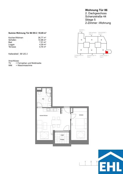 Die Wohnung selbst befindet sich im 2. Dachgeschoss und verfügt über eine großzügige Wohnküche mit vollausgestatteter Einbauküche, ein getrennt begehbares Schlafzimmer, ein Badezimmer mit Dusche, WC und Waschmaschinenanschluss, sowie einen Vorraum. Die dazugehörige Terrasse mit Loggia lädt zum gemütlichen Verweilen ein und rundet das Wohnerlebnis perfekt ab!