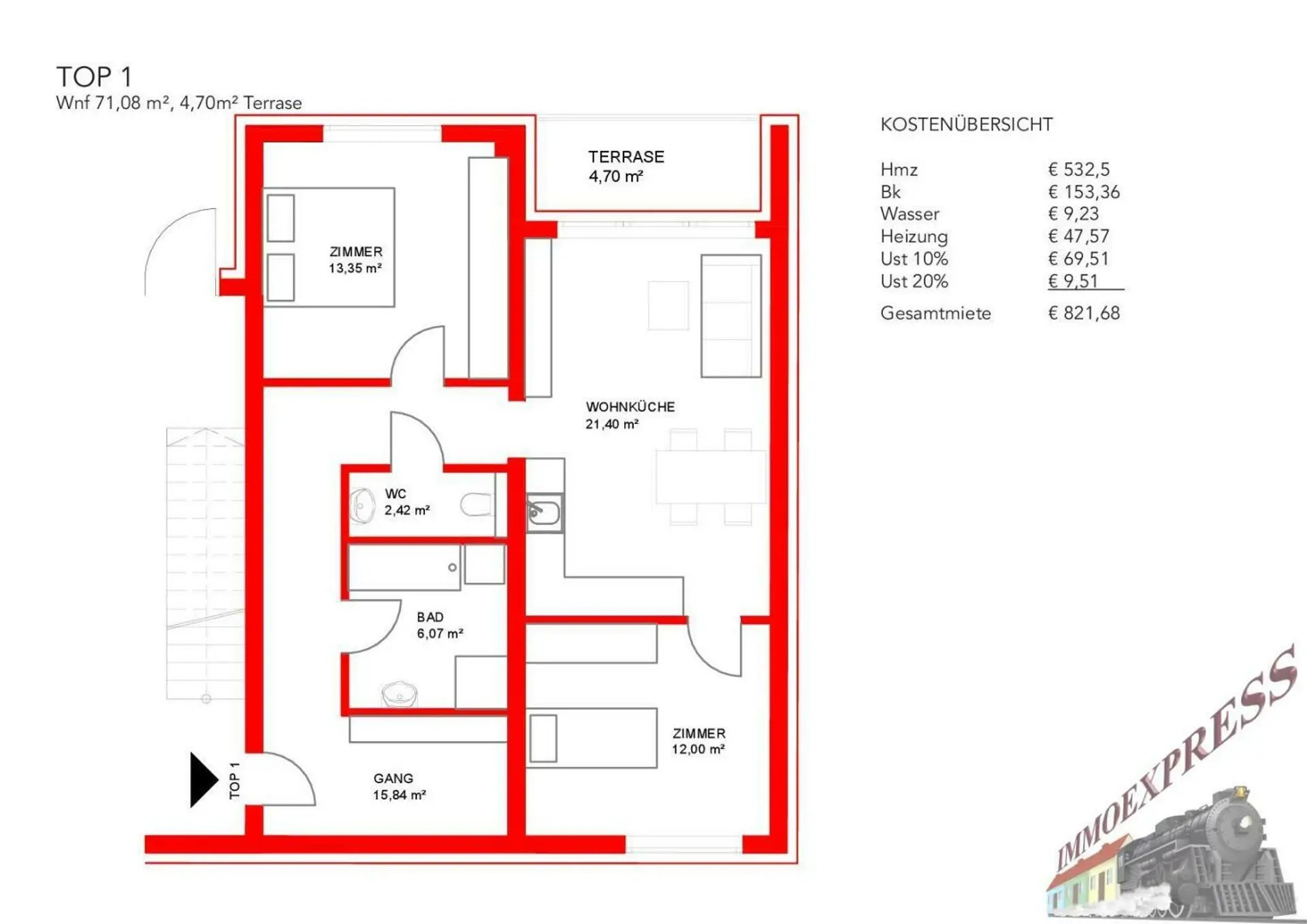 Miete: pro Monat € 917,43.- inklusive Betriebskosten + USt. und inkl. Heizung u. Warmwasser, inkl. KFZ-Stellplatz!