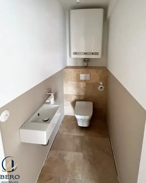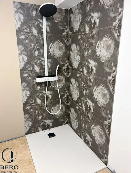Die moderne Dusche und die effiziente Luftwärmepumpe unterstreichen die hochwertige Ausstattung dieser Wohnung.