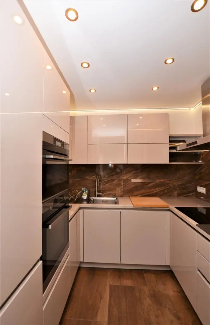 Das Wohnzimmer ist mit einer Couch und einer Wohnwand ausgestattet, während das Schlafzimmer über einen geräumigen Schrank verfügt. Die moderne Küche ist voll ausgestattet und beinhaltet sämtliche notwendigen Elektrogeräte: E-Herd, Backrohr, Geschirrspüler, Kühlschrank, Dunstabzug mit Abluft und Mikrowelle. Im Vorzimmer finden sich eine Garderobe sowie weitere Verstaumöglichkeiten, die für Ordnung im Eingangsbereich sorgen.