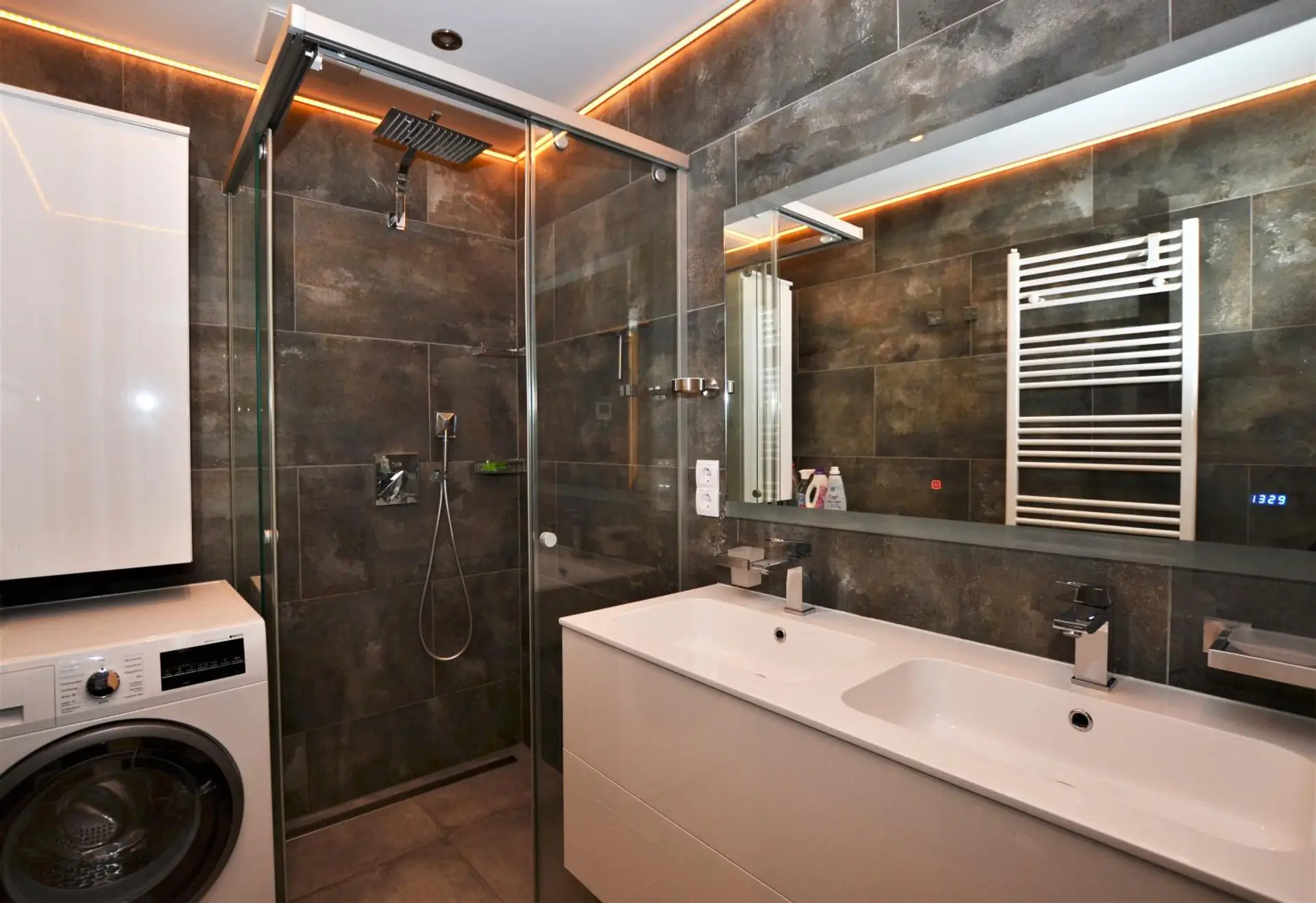 Das Badezimmer ist funktional gestaltet und mit einem Doppelwaschtisch, einer Walk-In Dusche sowie einer Waschmaschine am eigenen Waschmaschinenanschluss ausgestattet. Ein geräumiger Waschtischunterschrank bietet hier zusätzlichen Stauraum.