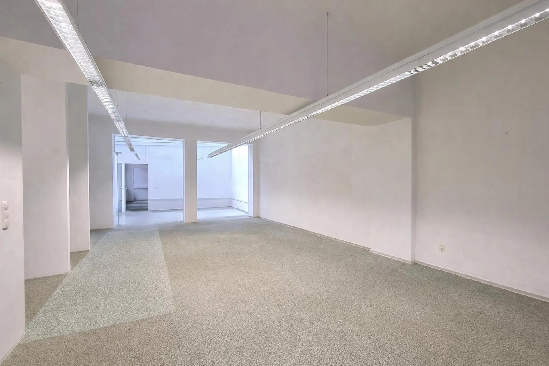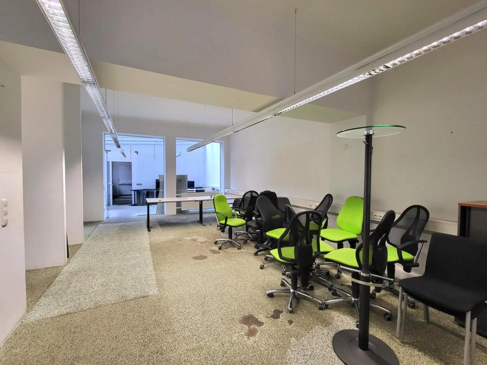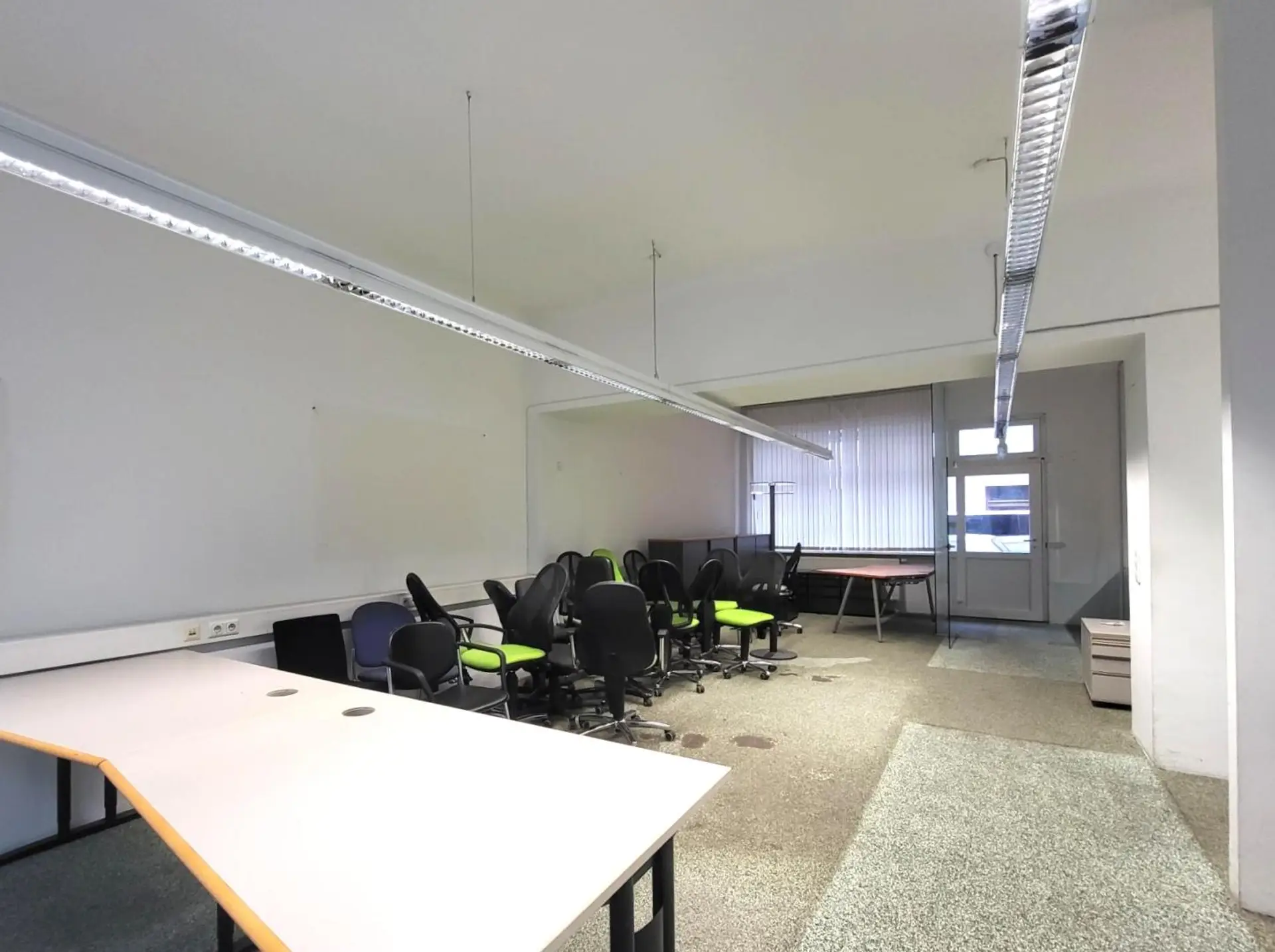 • mit einem Industrieboden, Raster-Hängeleuchten zur ausgewogenen Lichtbalance und großzügigen Fensterflächen, straßen-, wie auch