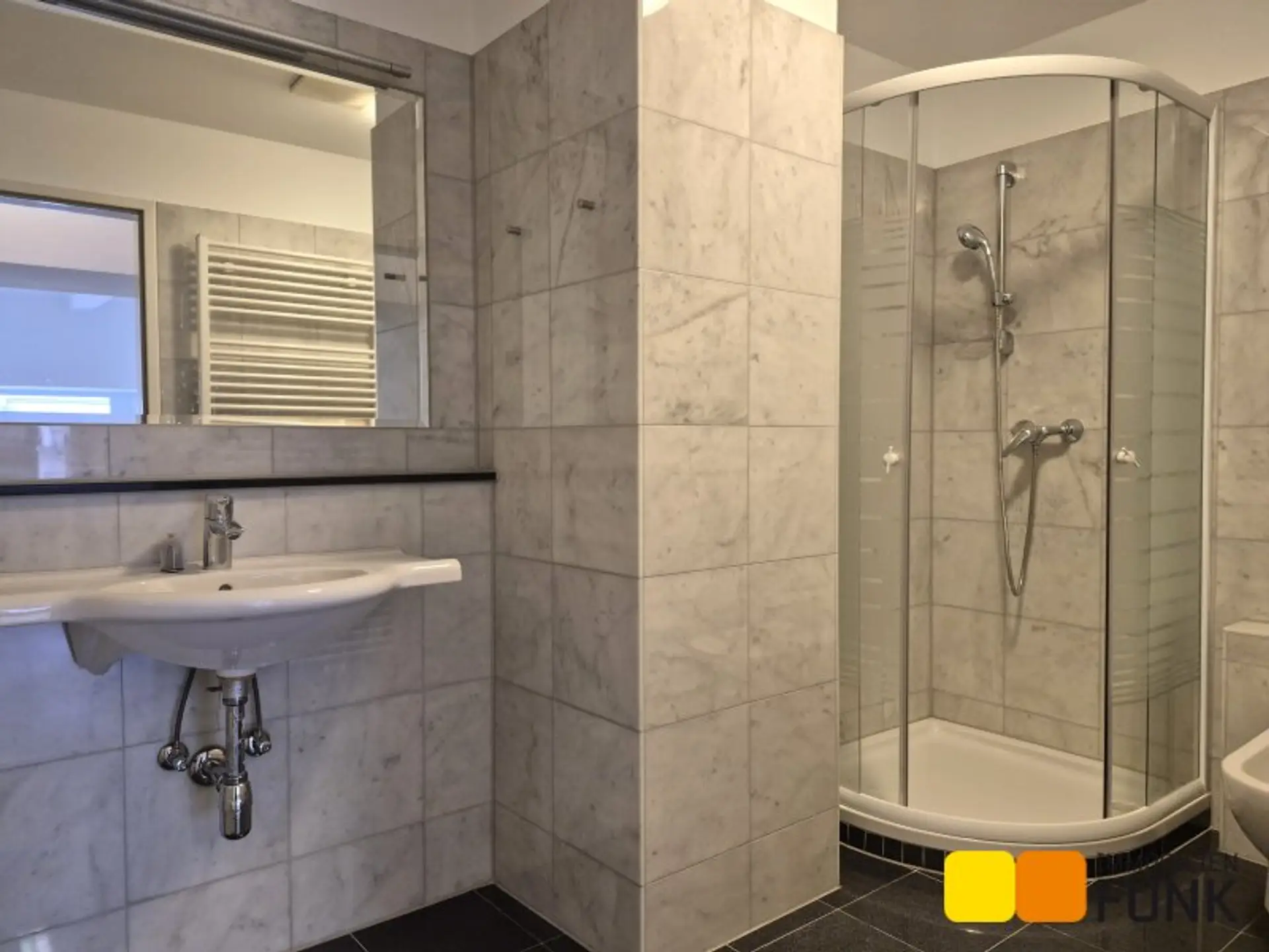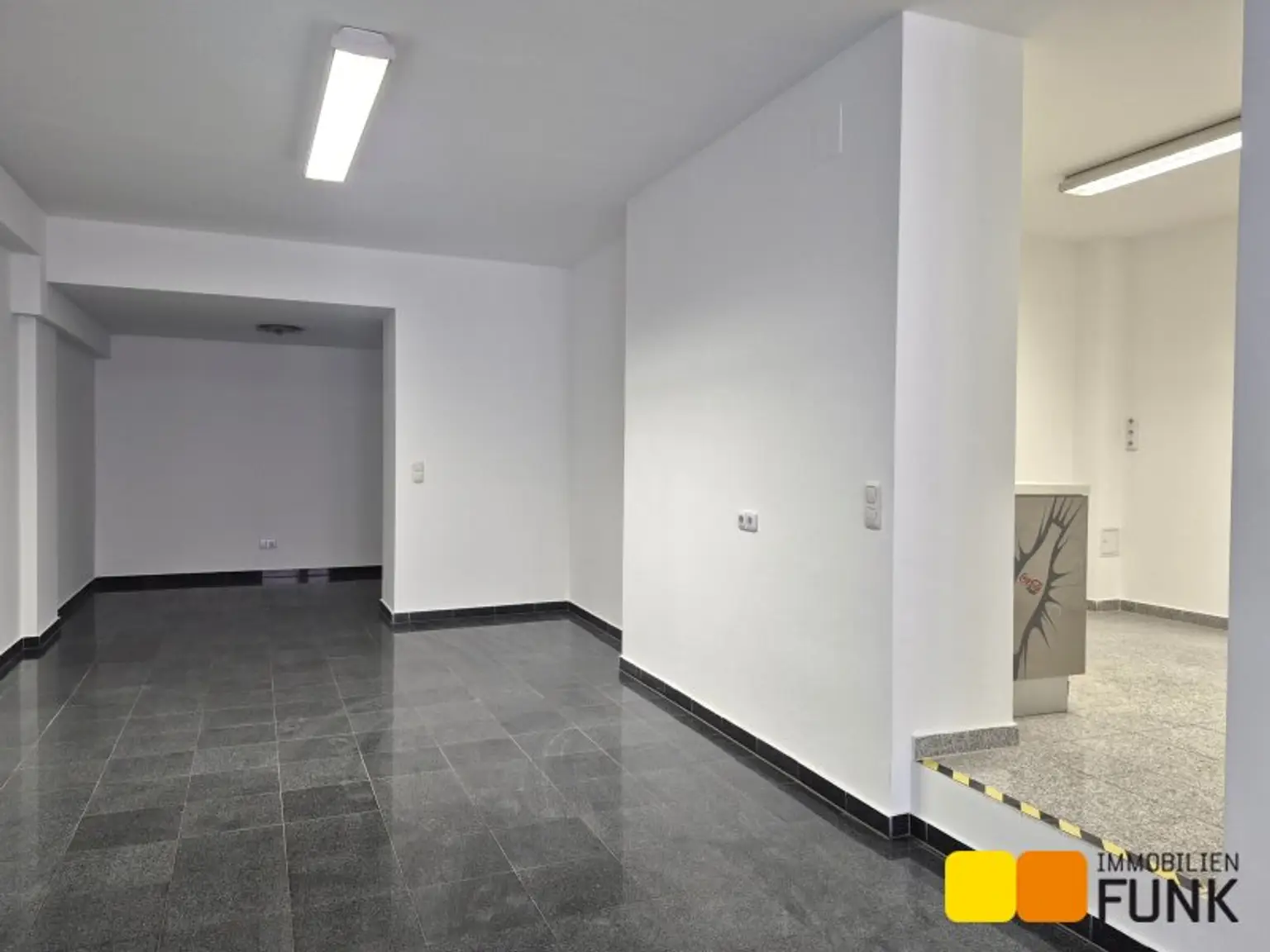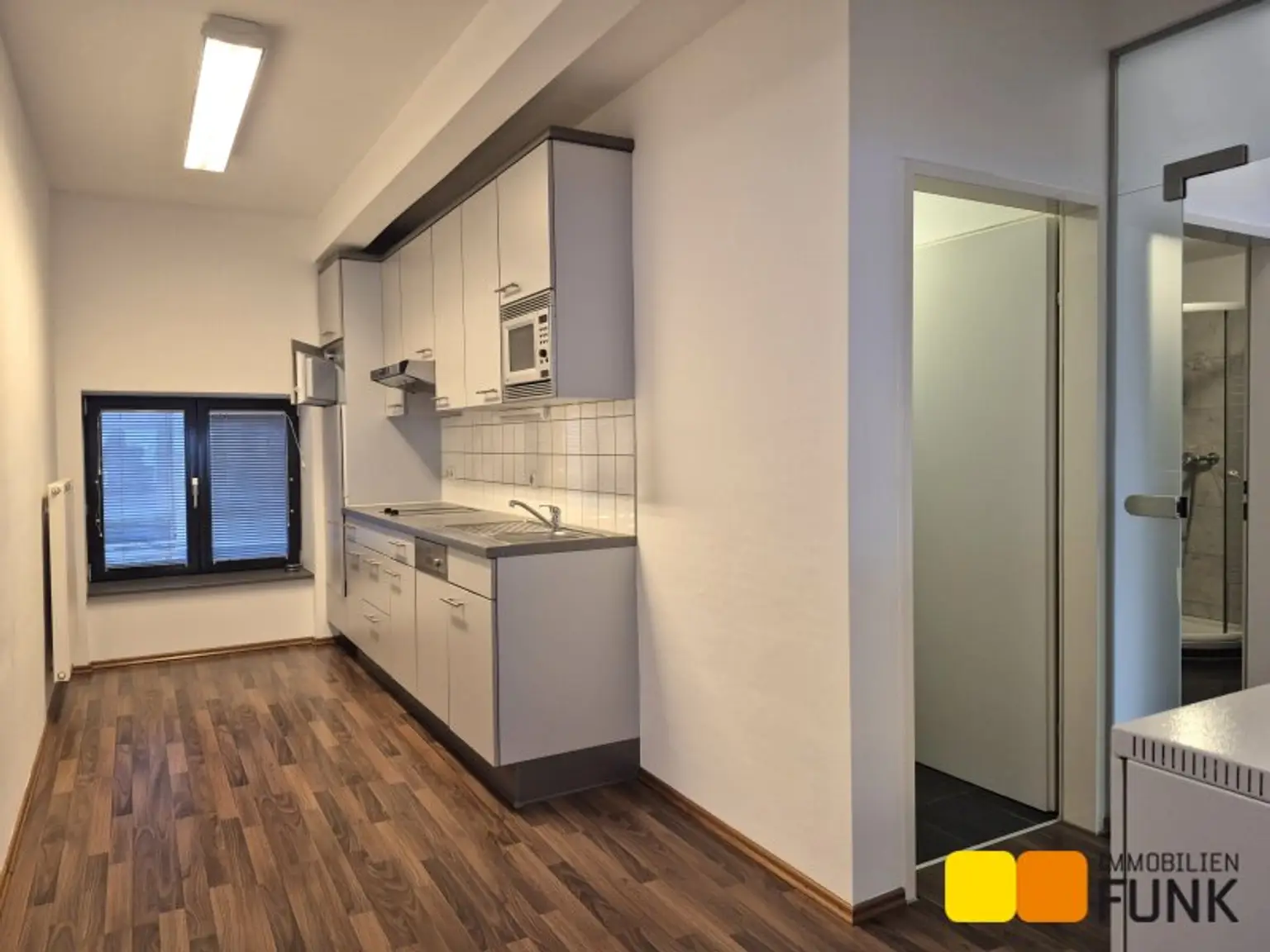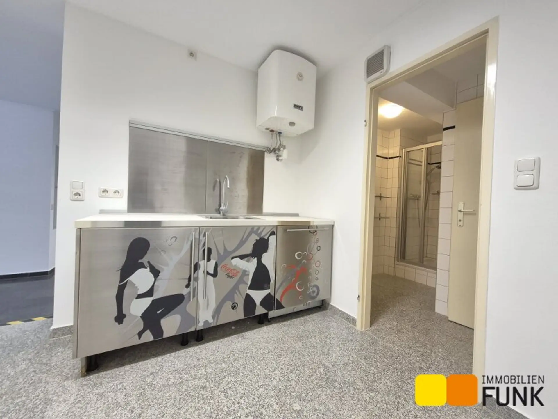 Eine moderne Küchenzeile ermöglicht unkomplizierte Versorgung für Team und Kunden. Komfortabel: Auf beiden Ebenen steht ein Badezimmer mit WC zur Verfügung – ideal für getrennte Mitarbeiter- und Kundenbereiche.