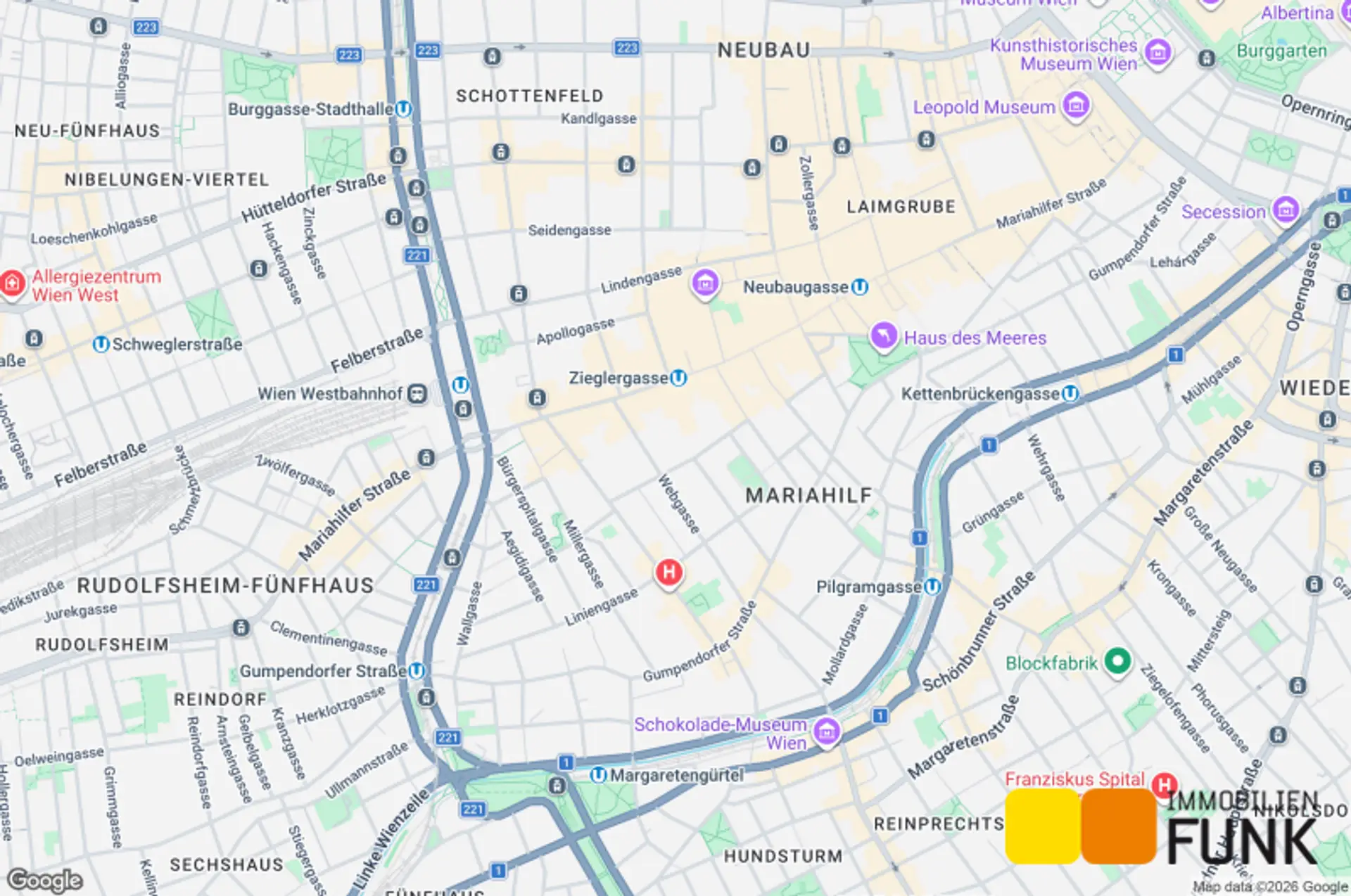 Dieses außergewöhnliche Büroobjekt befindet sich in einer der begehrtesten Lagen des 6. Bezirks. Die Mariahilfer Straße erreichen Sie in nur 3 Gehminuten, den Westbahnhof – mit den U-Bahn-Linien U3 und U6 sowie mehreren Straßenbahnlinien – in lediglich 4 Gehminuten. Die öffentliche Anbindung ist damit optimal, und gleichzeitig profitieren Sie von der unmittelbaren Nähe zu einer der größten Einkaufs- und Flaniermeilen Österreichs. Zahlreiche Geschäfte, Ärzte, Apotheken, Schulen und Kinderbetreuungseinrichtungen befinden sich in direkter Umgebung.