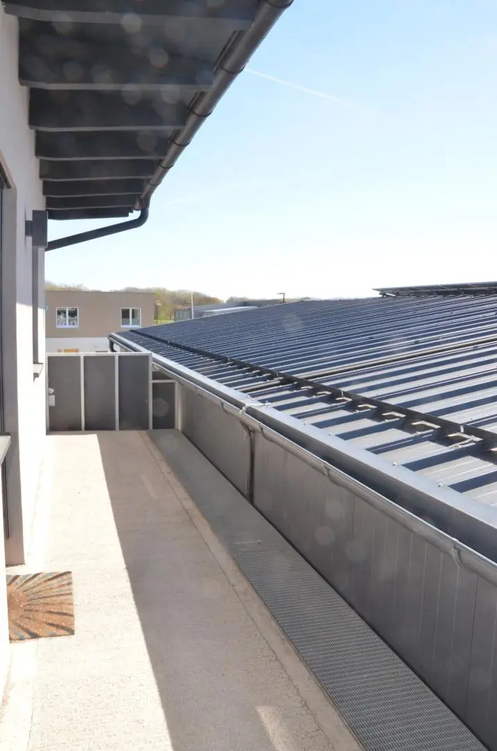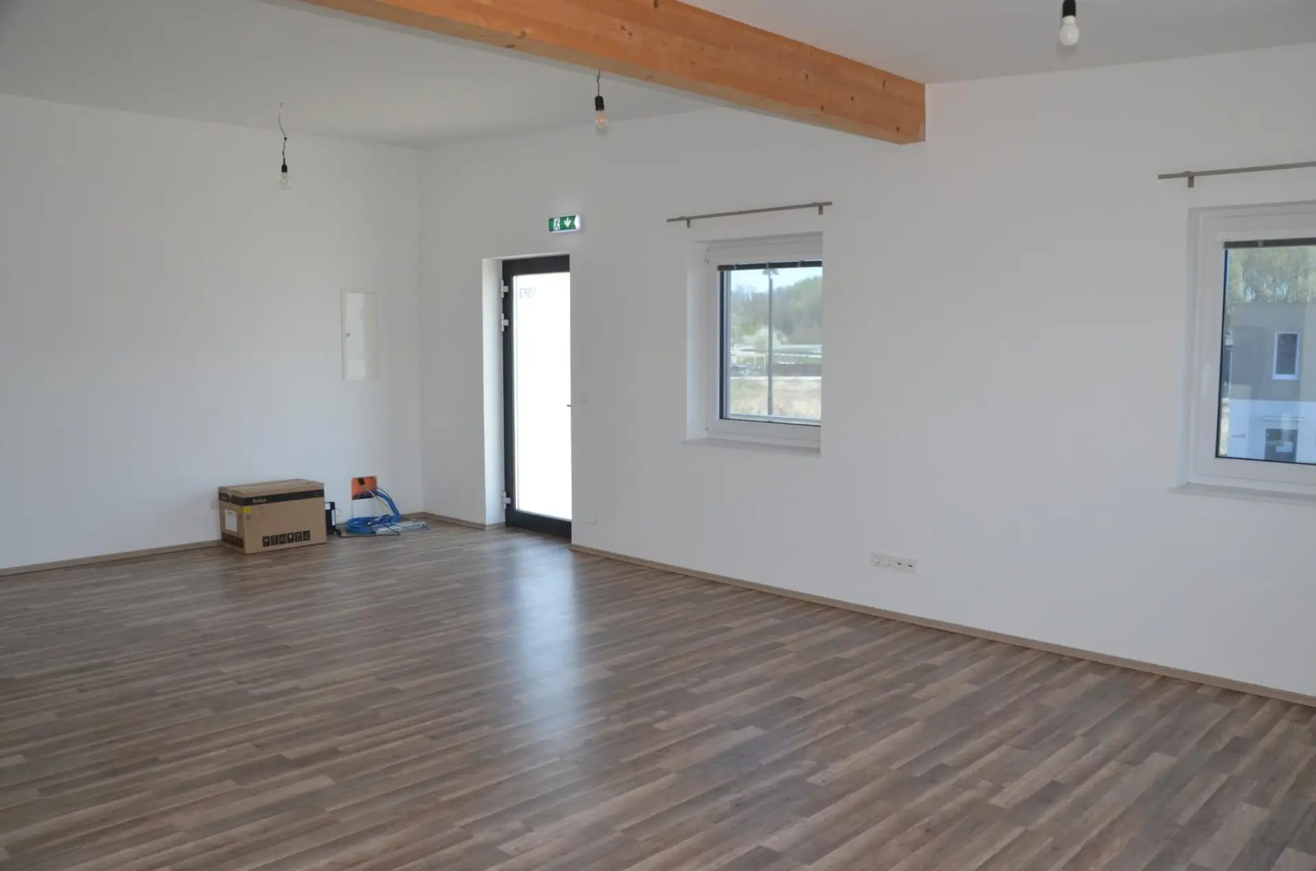 Große Fensterflächen sorgen für eine helle und angenehme Arbeitsatmosphäre, während die sichtbaren Holzbalken dem Raum einen modernen und zugleich hochwertigen Charakter verleihen.