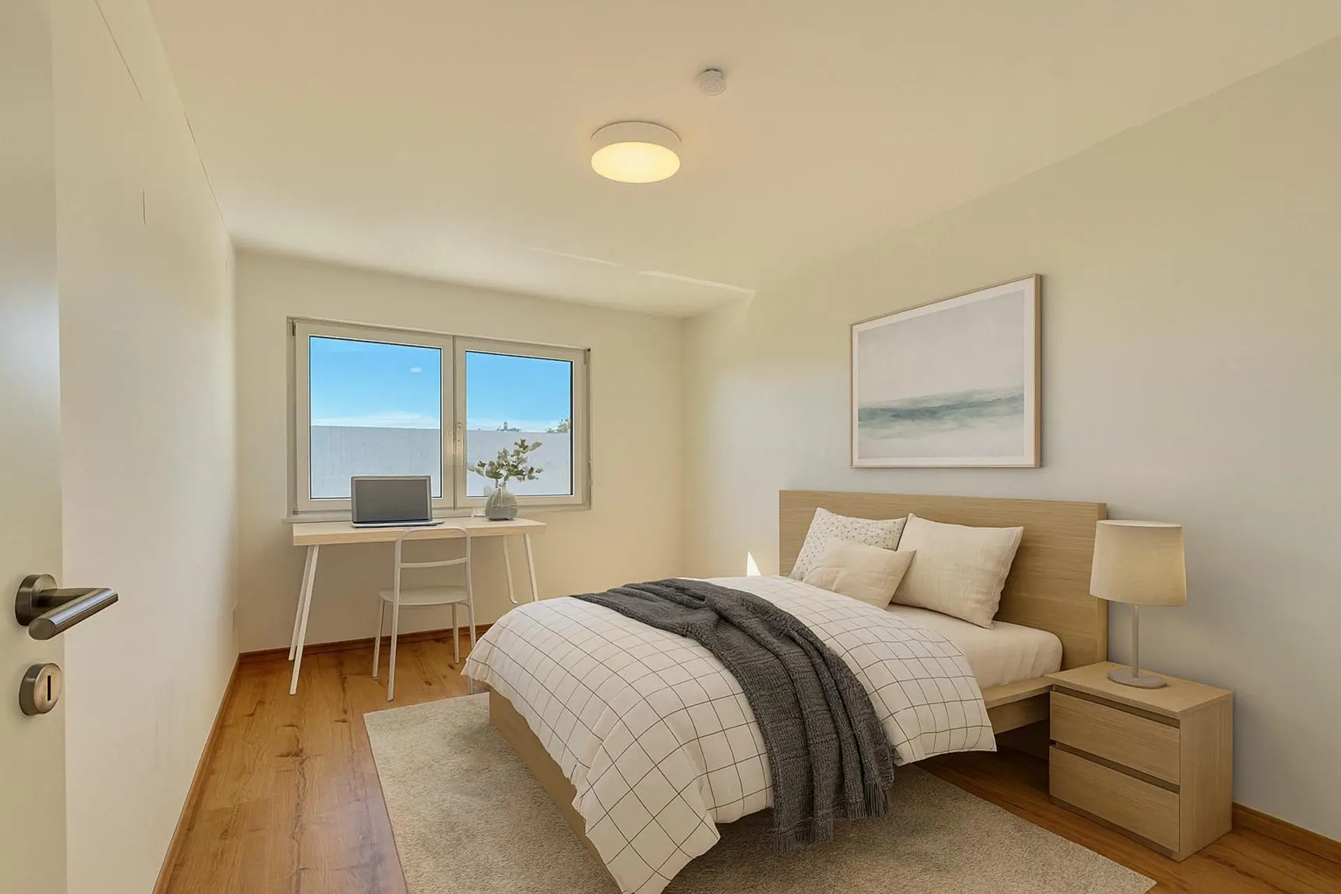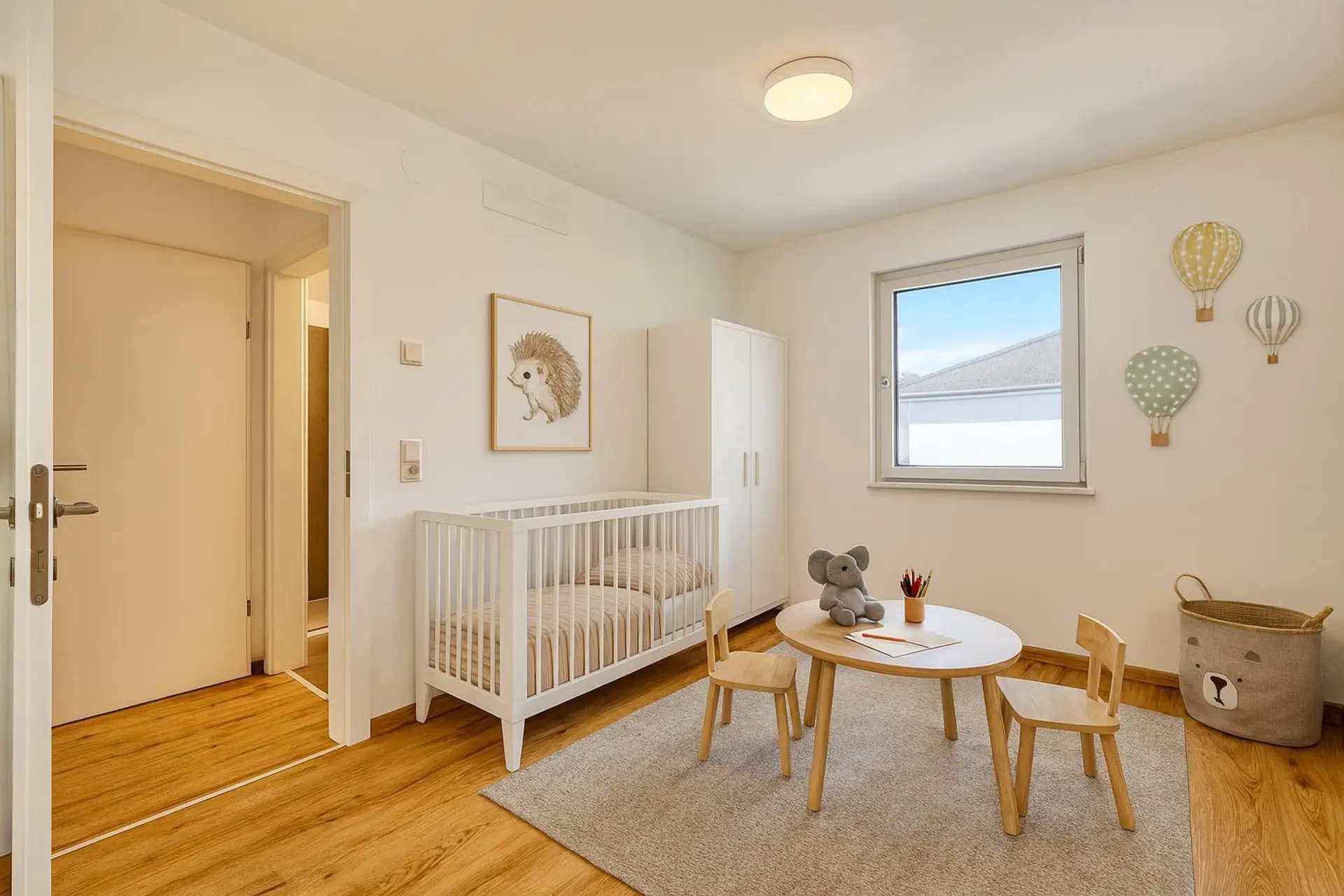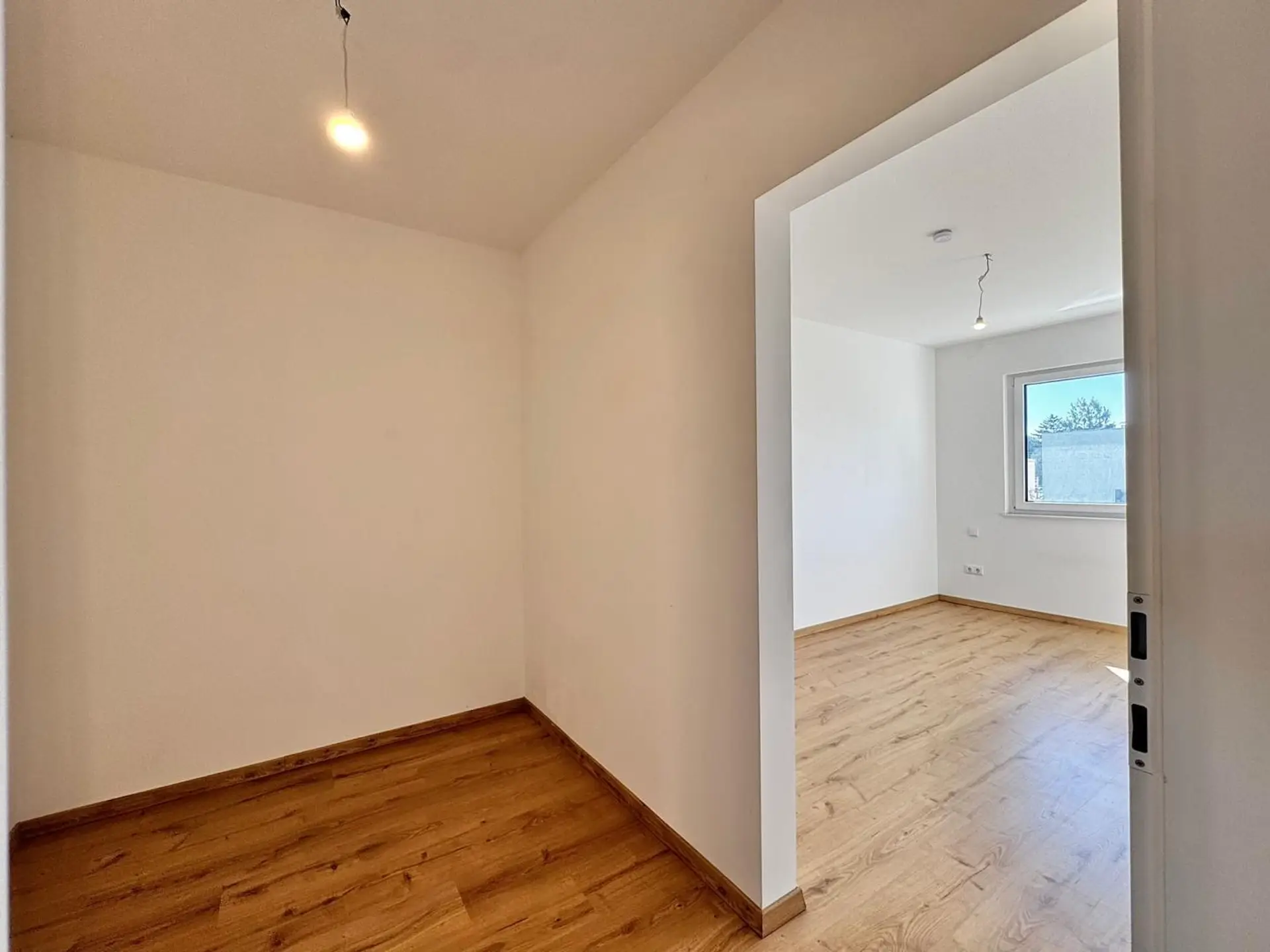 Dieses moderne Reihenhaus bietet mit rund 110 m² Wohnfläche ein durchdachtes Raumkonzept, das sowohl Familien als auch Paare anspricht. Vier Zimmer sorgen für ausreichend Platz, wobei eines der Schlafzimmer durch einen direkt angeschlossenen Schrankraum ergänzt wird – ein praktisches Detail, das Komfort und Ordnung in den Alltag bringt.