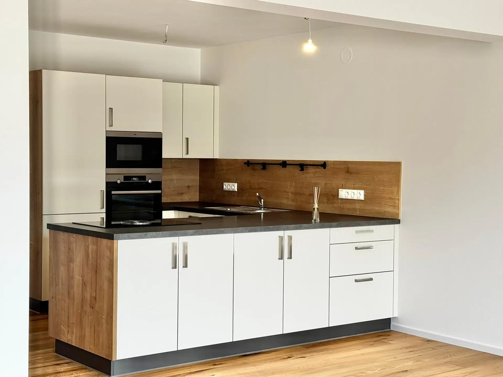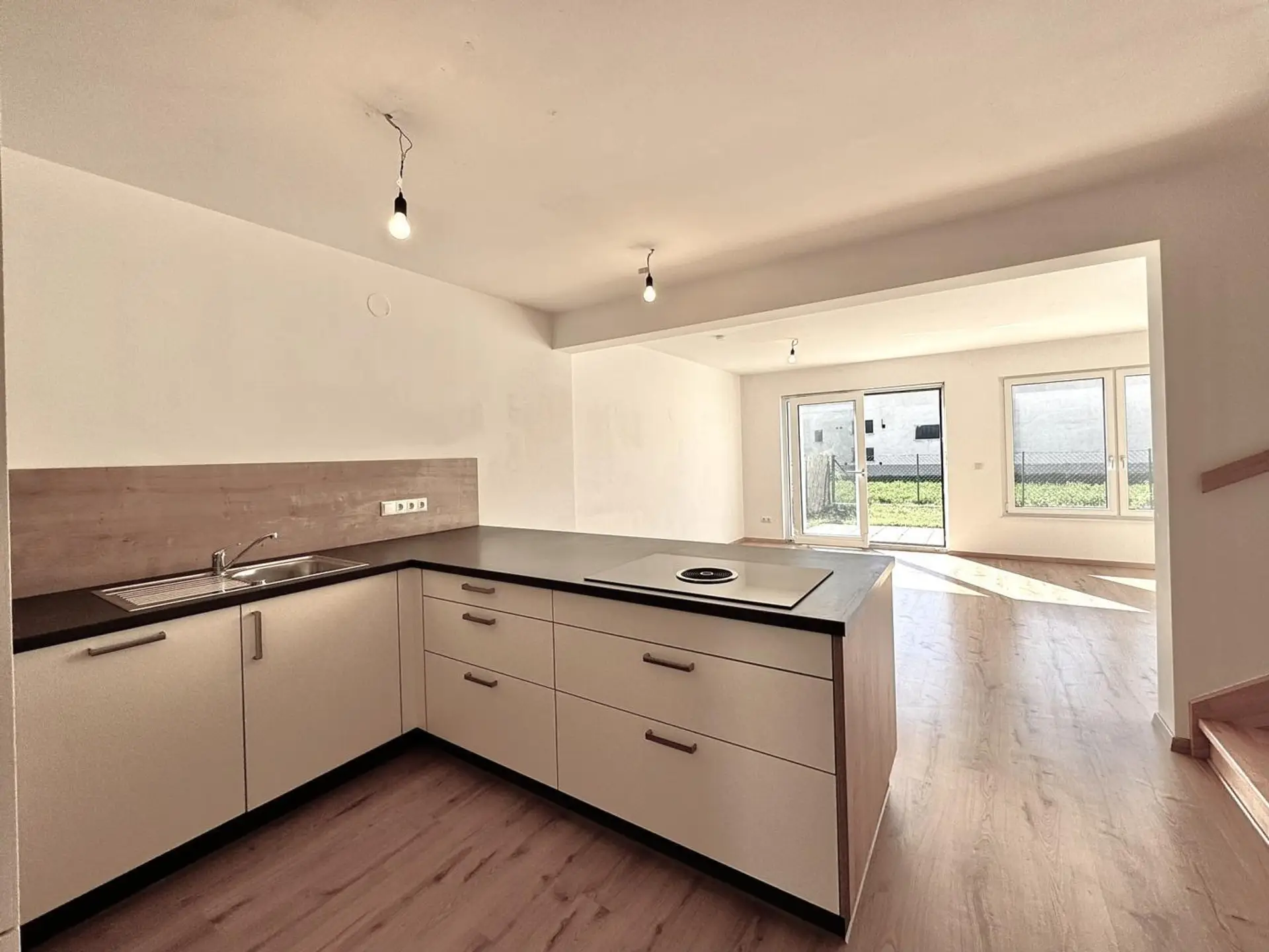 Im Erdgeschoss bildet die moderne Wohnküche das Herzstück des Hauses. Sie ist offen gestaltet und verbindet Kochen, Essen und Wohnen zu einem kommunikativen Zentrum. Von hier aus gelangt man direkt auf die Terrasse sowie in den kleinen, pflegeleichten Eigengarten, der in den warmen Monaten zusätzlichen Lebensraum im Freien schafft.