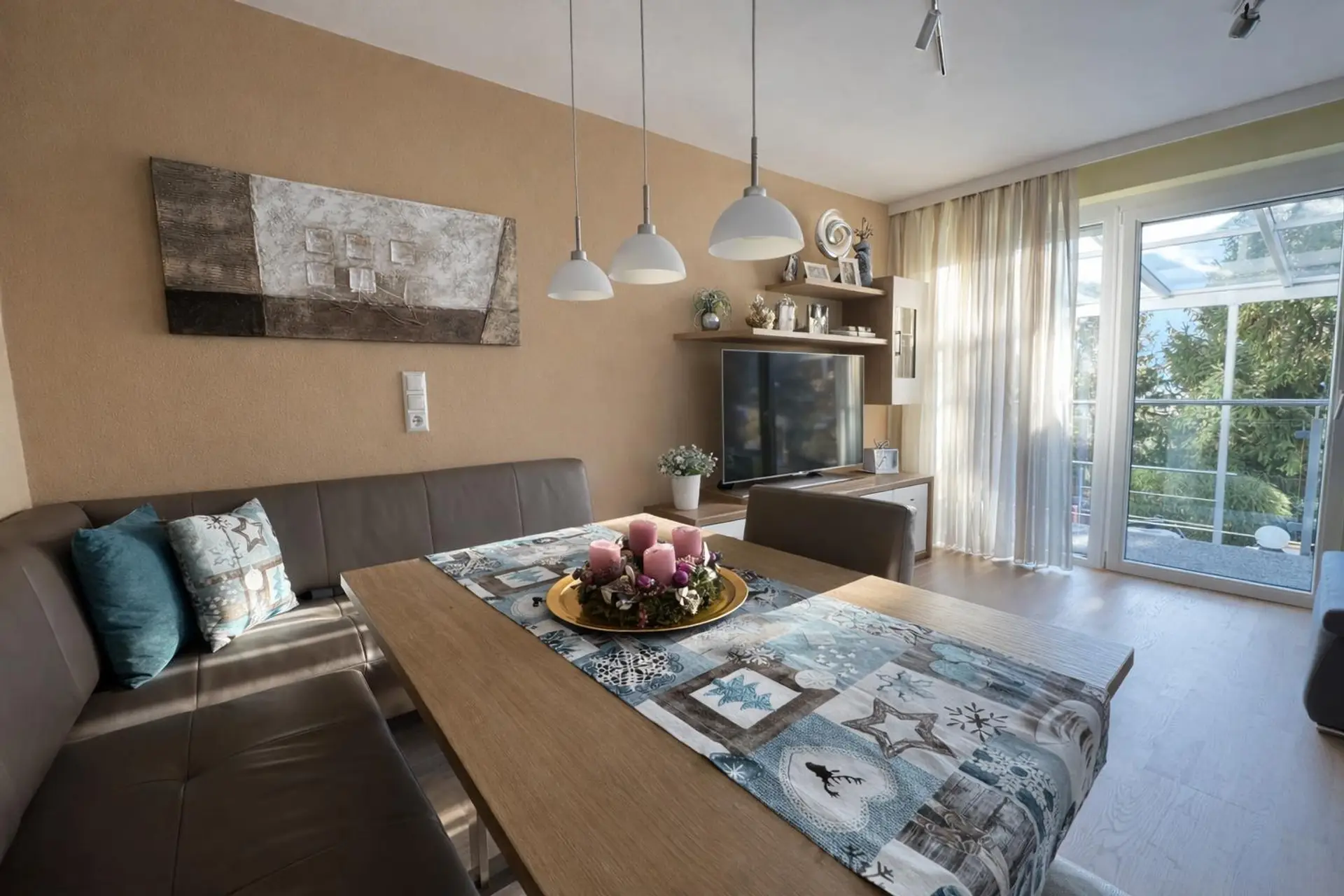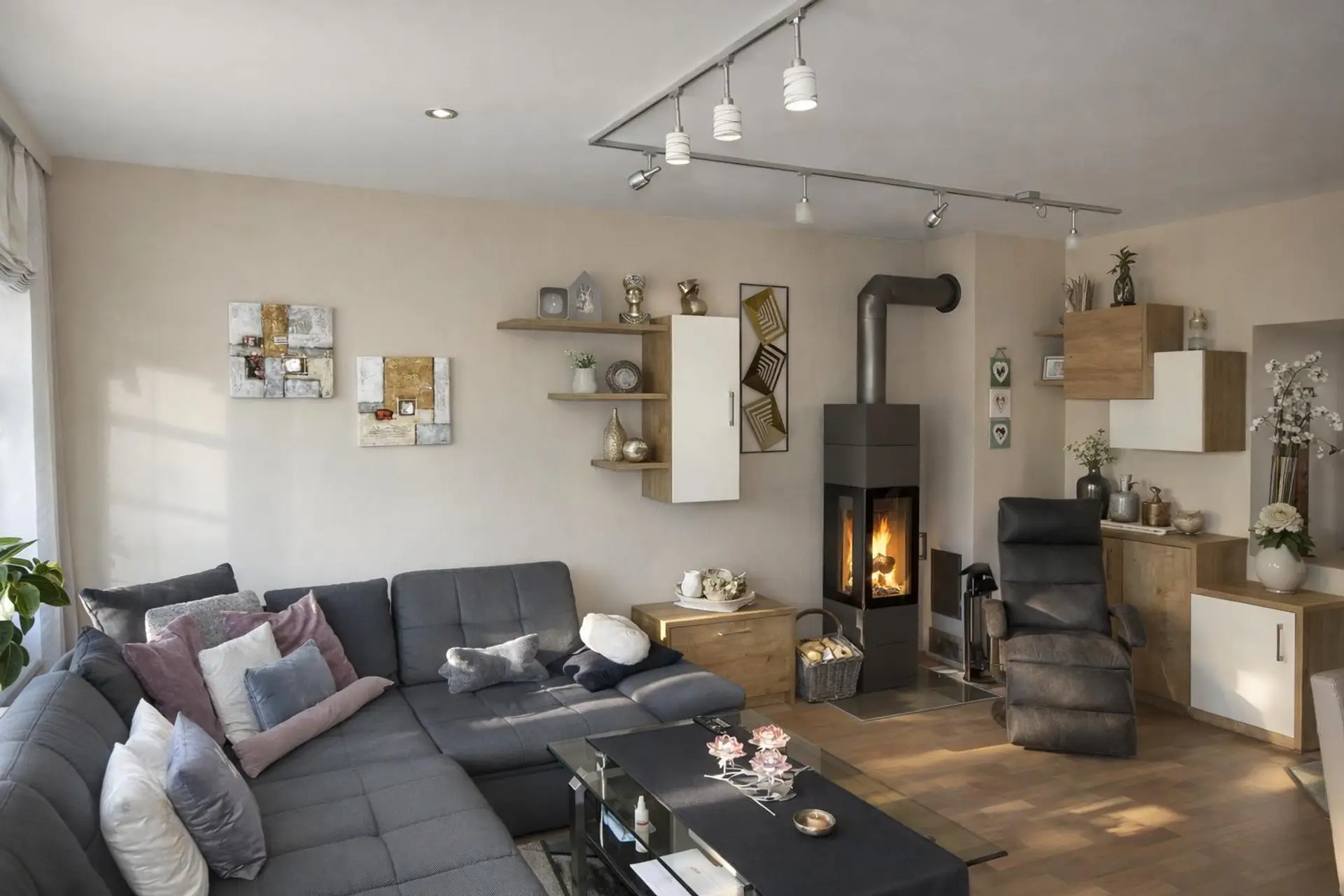 - Heller Wohnbereich mit gemütlichem Kaminofen und direktem Zugang zu Terrasse und Garten