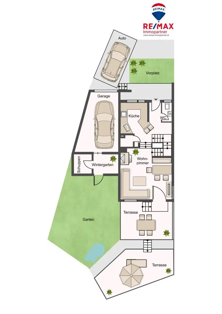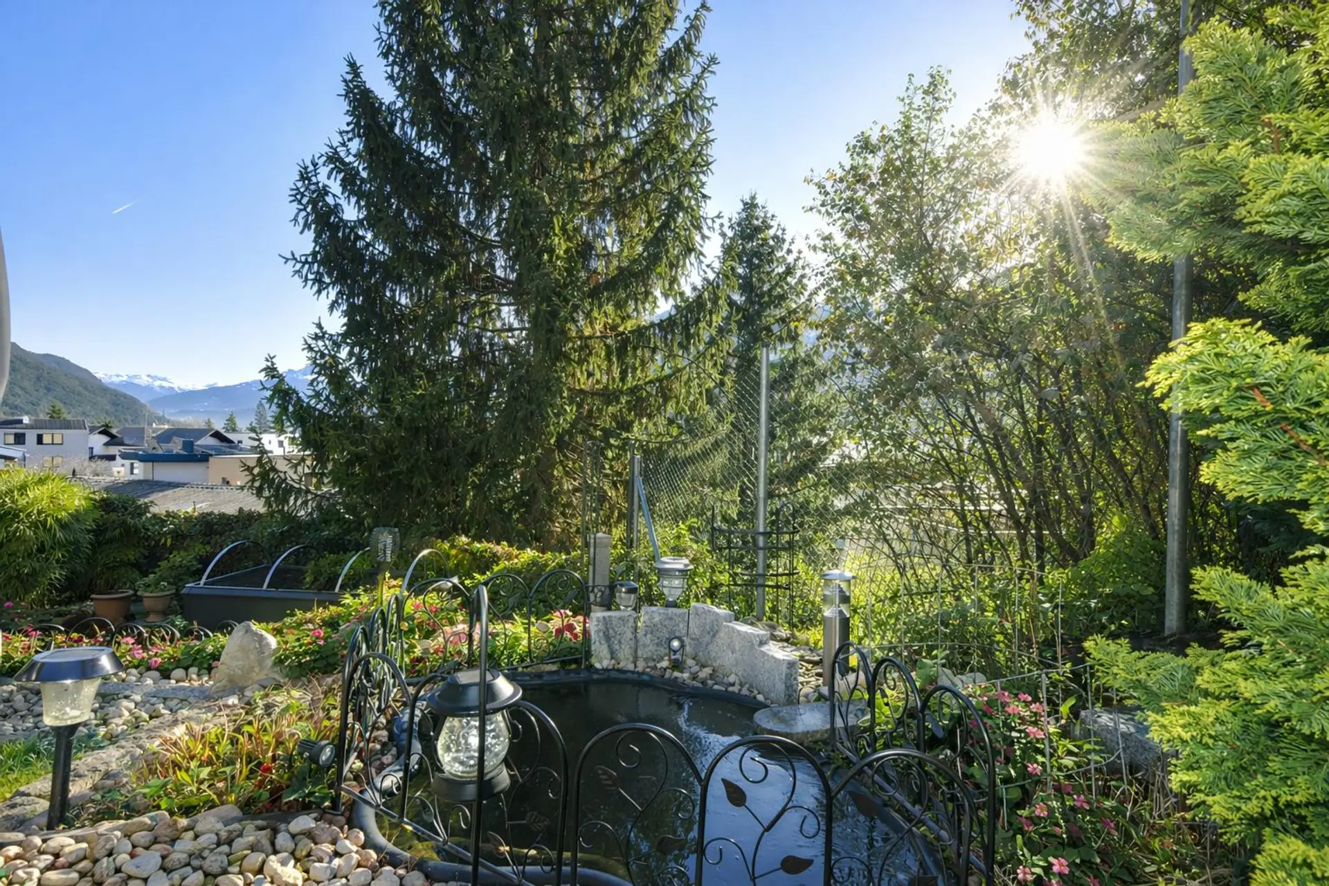 - Privater Garten auf mehreren Ebenen mit Terrasse, Balkon und Teich