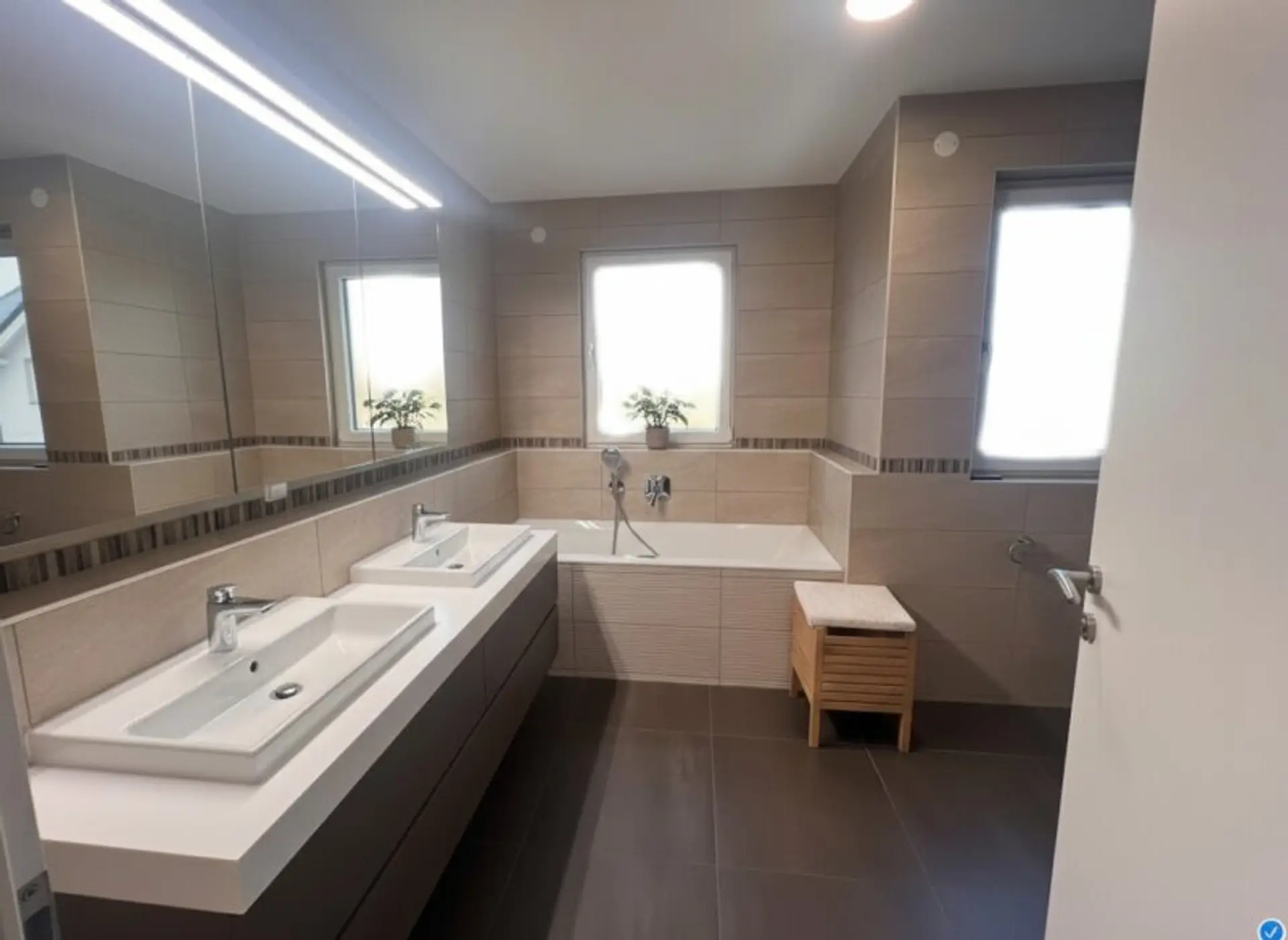 * Geräumiges Tageslicht-Badezimmer mit Badewanne, Dusche, Doppelwaschbecken und WC