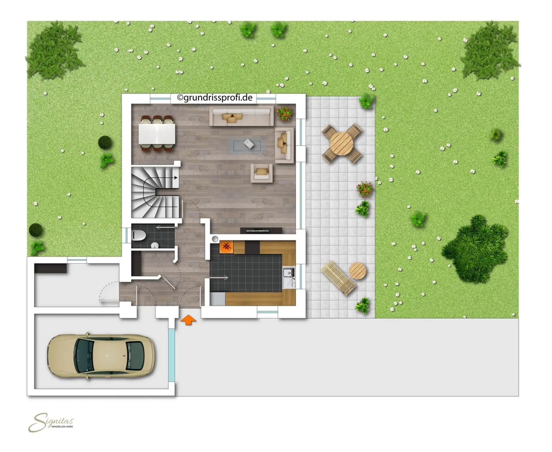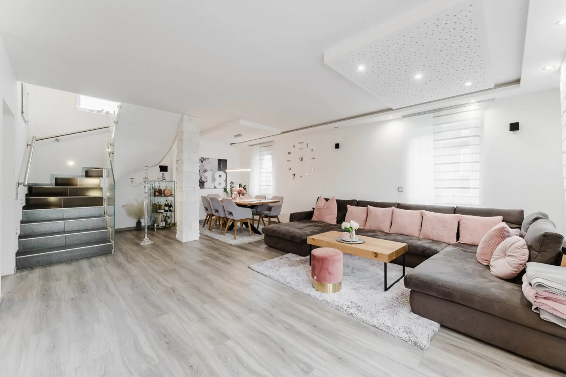 Im Erdgeschoss liegt der großzügige Wohn- und Essbereich mit Zugang zur überdachten Terrasse – ein idealer Platz für gemeinsame Stunden mit Familie und Freunden. Die separate, modern ausgestattete Küche bietet viel Raum zum Kochen und Genießen.