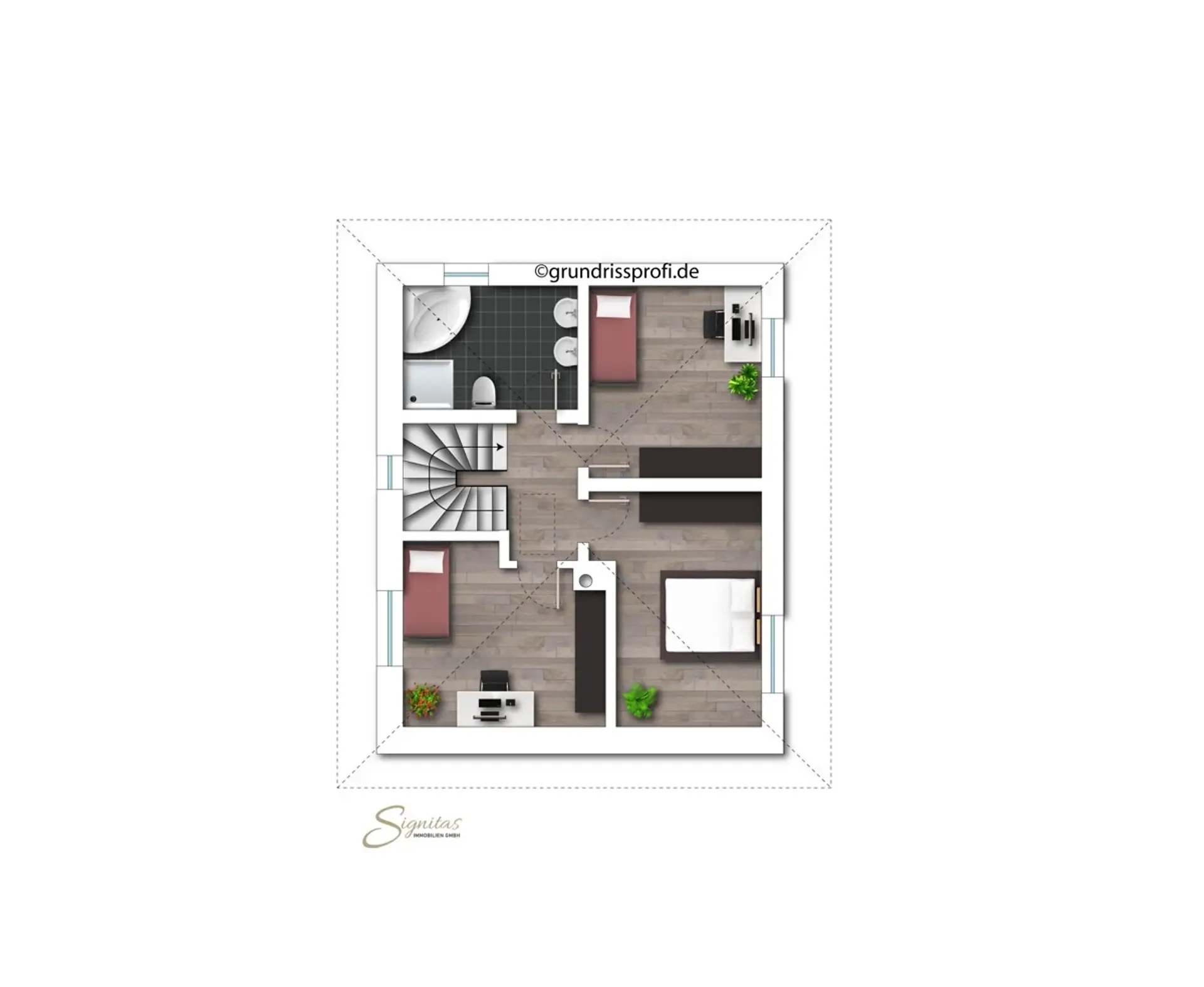 Im Obergeschoss befinden sich drei gemütliche Schlafzimmer sowie ein helles, geräumiges Badezimmer mit Badewanne, Dusche und Doppelwaschtisch. Ergänzt wird das Raumangebot durch eine Gästetoilette, einen Abstellraum und einen Technikraum.
