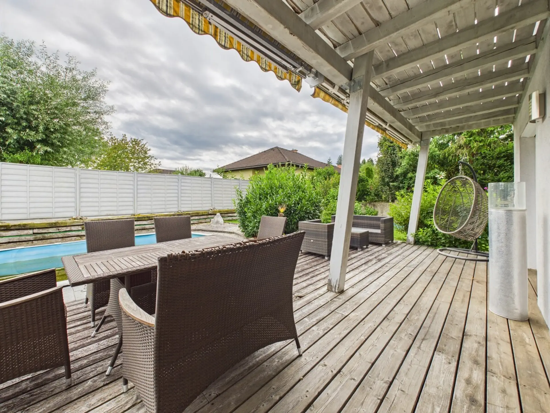 Der Garten ist ein Ort der Entspannung und bietet gleichzeitig reichlich Gestaltungsspielraum für Ihre persönlichen Ideen. Teile der Außenanlage, wie der Terrassenbelag und Bereiche der Unteransicht, sind sanierungsbedürftig und warten darauf, von Ihnen neu interpretiert zu werden. Dank der sehr guten Isolierung und der energieeffizienten Erdwärmepumpe liegt der jährliche Energieverbrauch bei unter 8.000 kWh – und sorgt so für angenehm niedrige Betriebskosten.