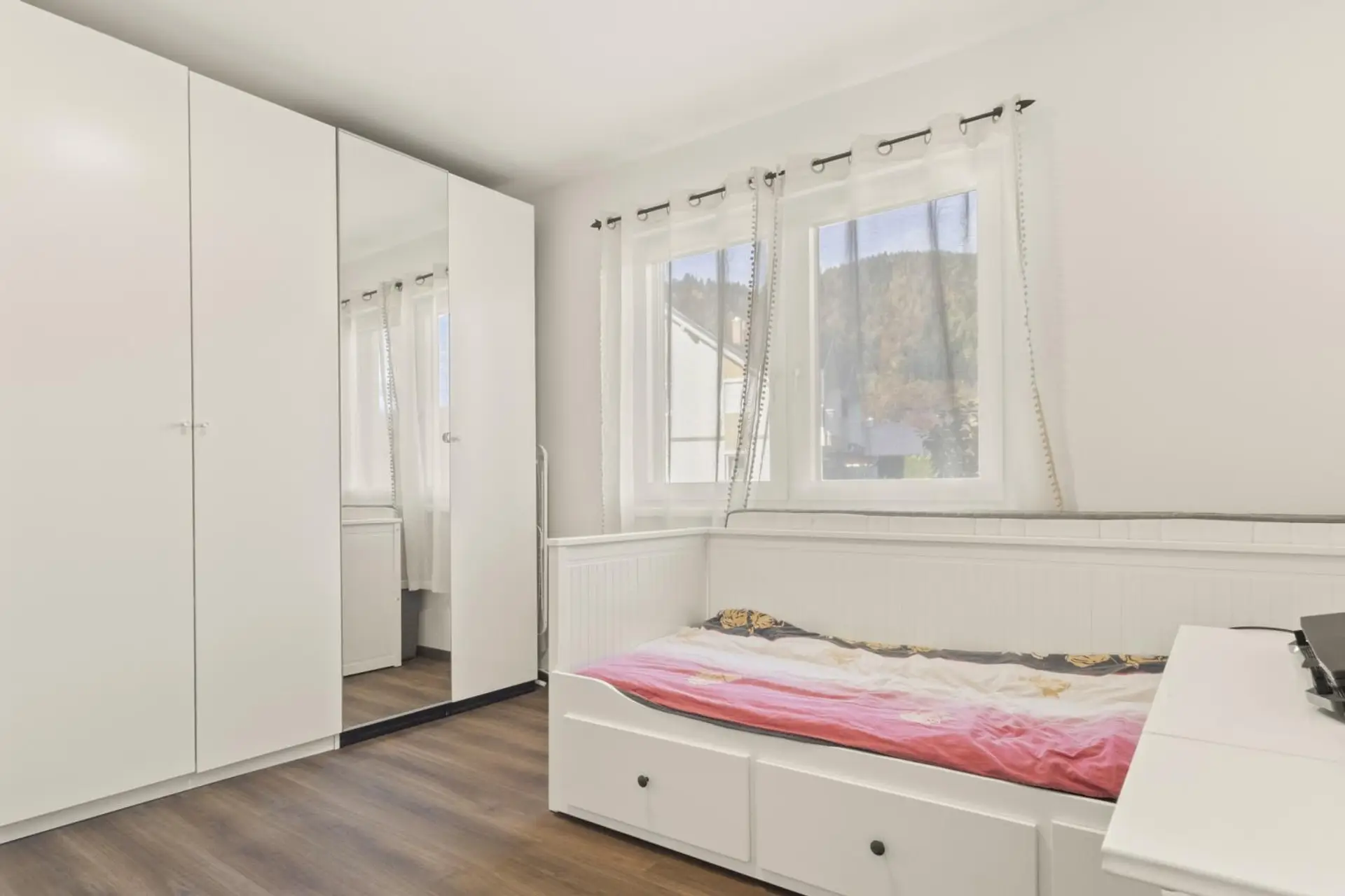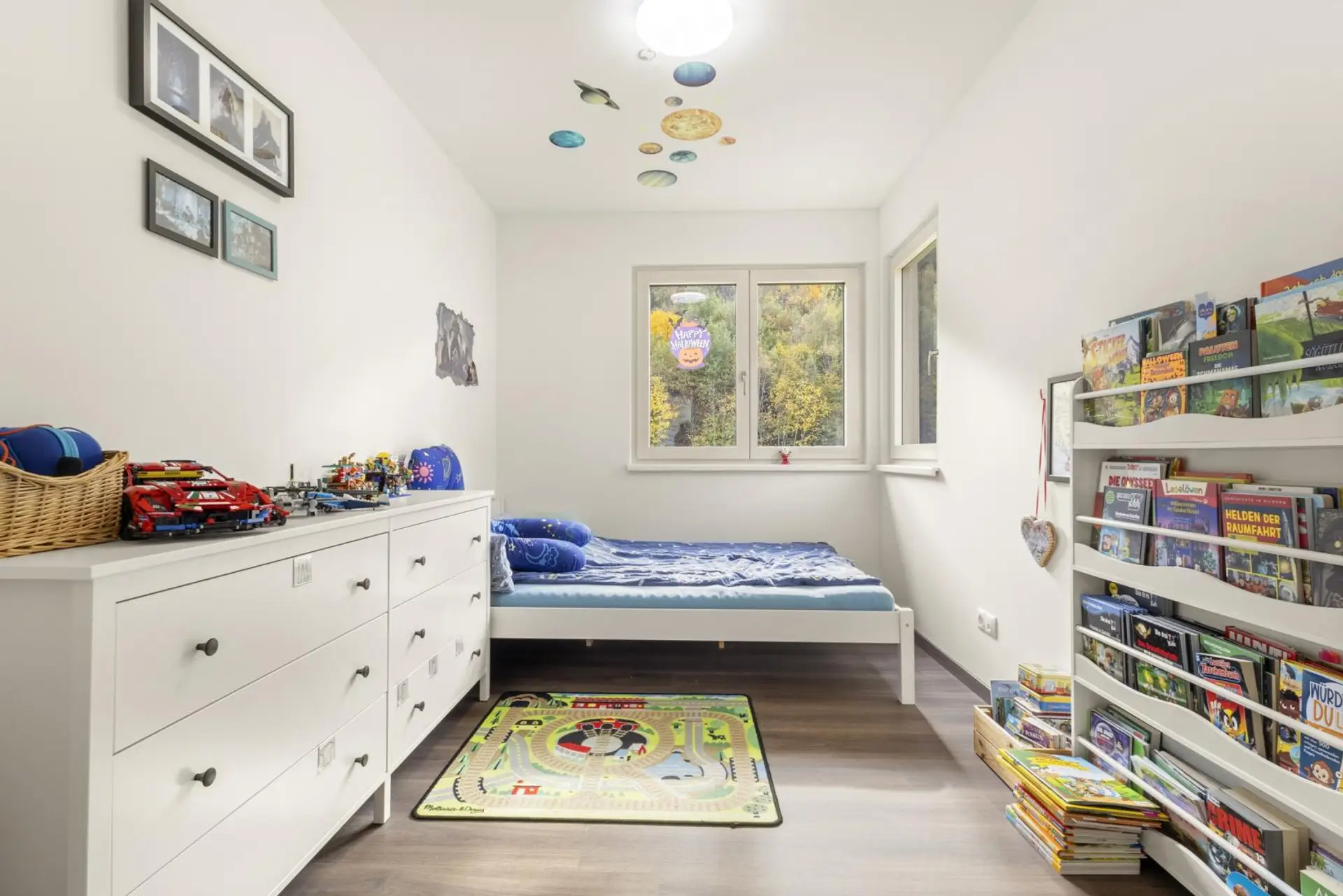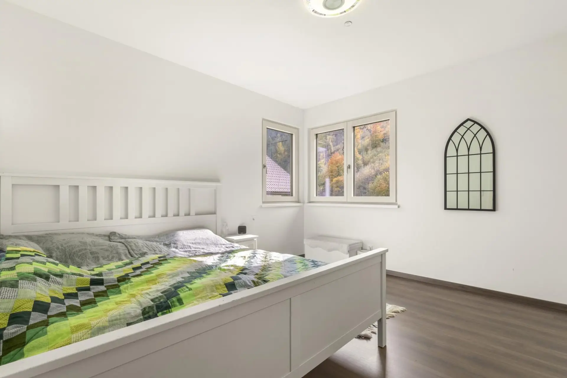 Im Obergeschoss bietet das Hauptschlafzimmer, das mit einem begehbaren Kleiderschrank ausgestattet ist, besonderen Wohnkomfort. Das Badezimmer verfügt über Dusche, Badewanne und WC. Drei weitere Zimmer eröffnen flexible Nutzungsmöglichkeiten zum Beispiel als Kinderzimmer, Büro oder Hobbyraum. Im Erdgeschoss befinden sich noch ein (Gäste-)Zimmer sowie ein weiteres Badezimmer mit Dusche und WC.