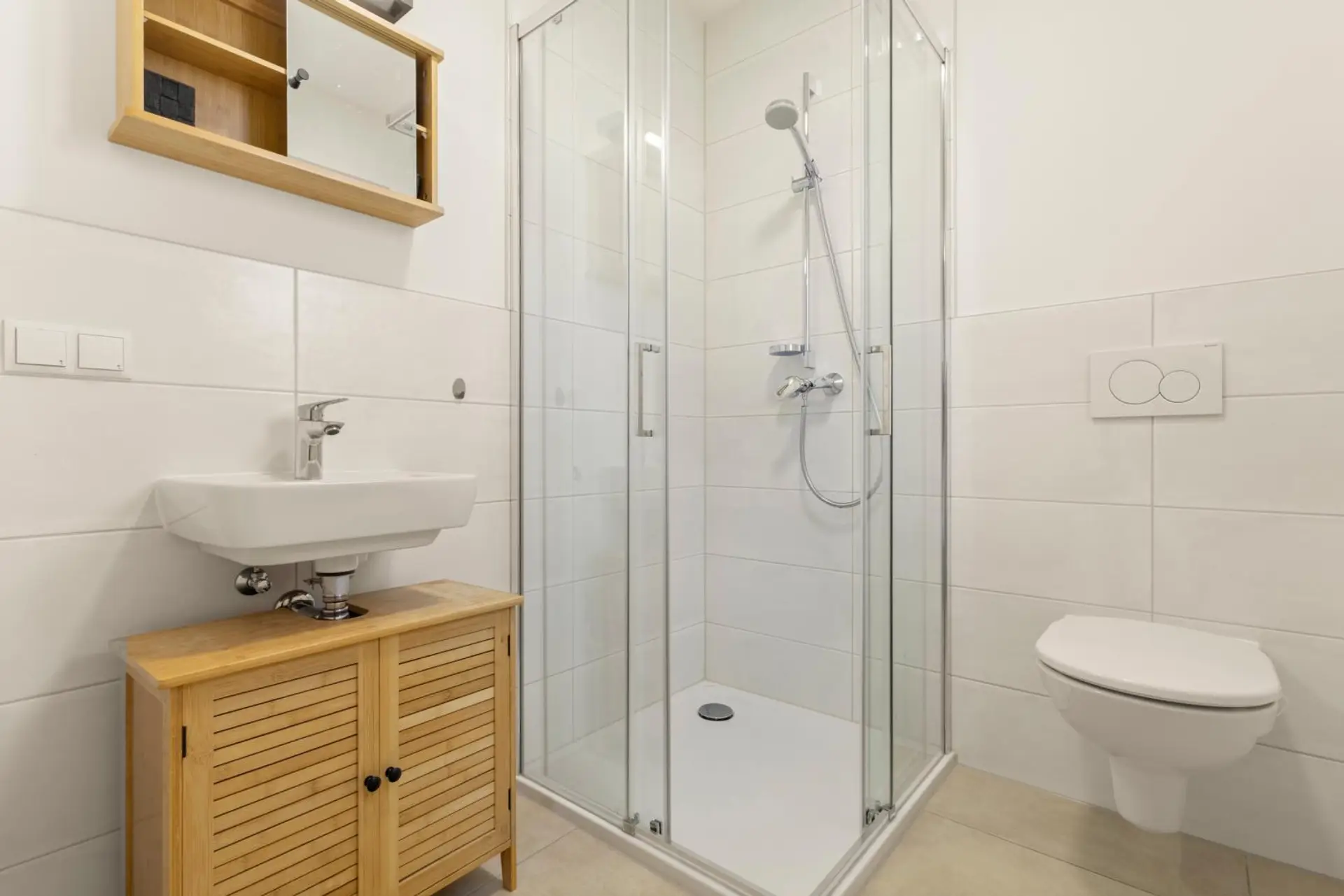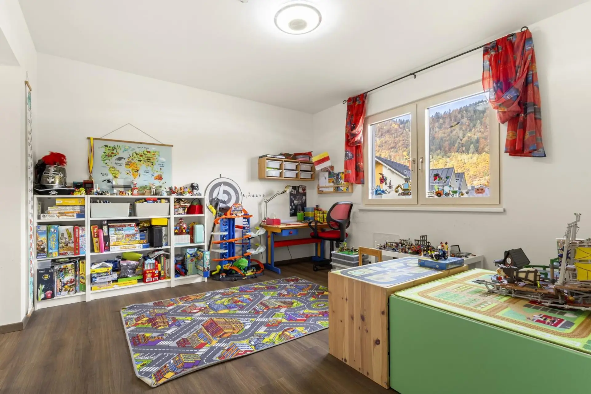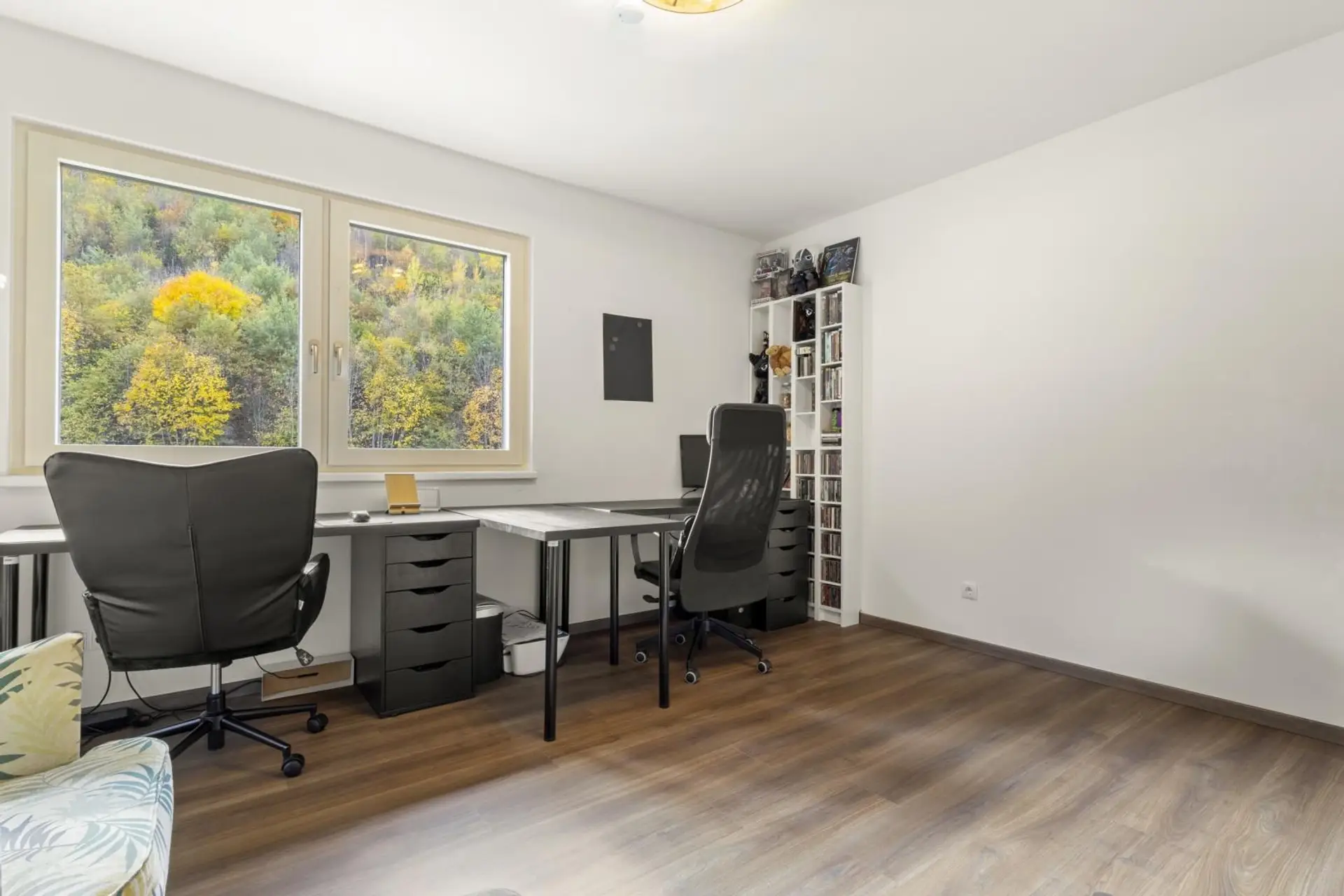 Im Obergeschoss bietet das Hauptschlafzimmer, das mit einem begehbaren Kleiderschrank ausgestattet ist, besonderen Wohnkomfort. Das Badezimmer verfügt über Dusche, Badewanne und WC. Drei weitere Zimmer eröffnen flexible Nutzungsmöglichkeiten zum Beispiel als Kinderzimmer, Büro oder Hobbyraum. Im Erdgeschoss befinden sich noch ein (Gäste-)Zimmer sowie ein weiteres Badezimmer mit Dusche und WC.