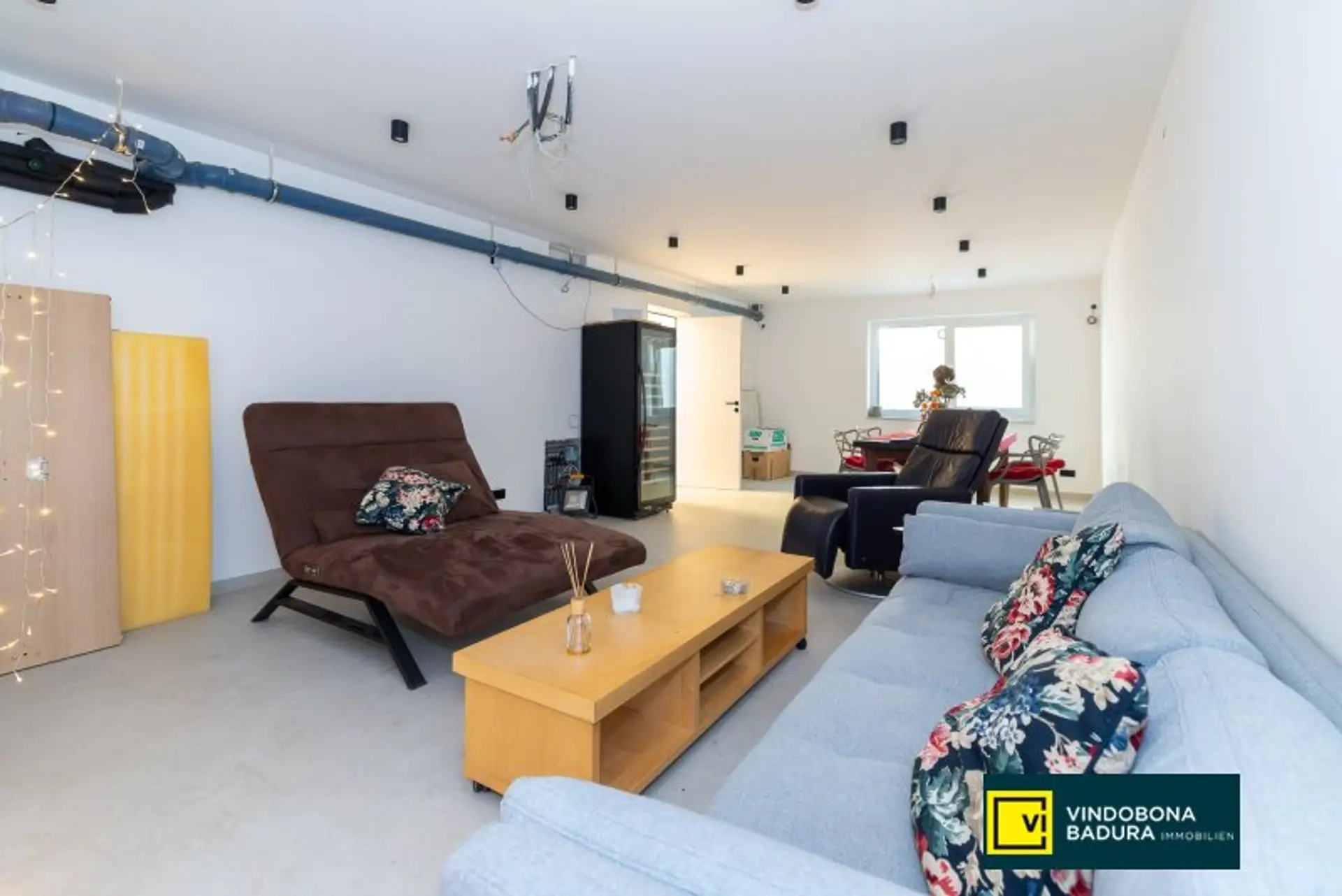 Der Keller bietet einen großzügigen, ca. 38 m² großen Party- bzw. Hobbyraum. Anschlüsse für Musiksystem, Beamer sowie vorbereitete Baranschlüsse inklusive Wasser- und Kanalanschluss sind vorhanden. Zusätzlich stehen eine Sauna, eine Dusche sowie ein separates WC zur Verfügung. Ergänzt wird das Raumangebot durch einen großen Abstellraum sowie eine kombinierte Waschküche mit Technikraum.