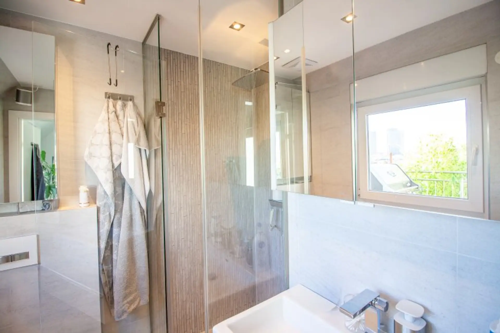 Die Wohnung verfügt über drei Zimmer, zwei Bäder (ein Badezimmer mit Dusche und WC, ein weiteres Bad mit Dusche und separatem WC), sowie einen großzügigen Wohn-Essbereich mit offener Küche.