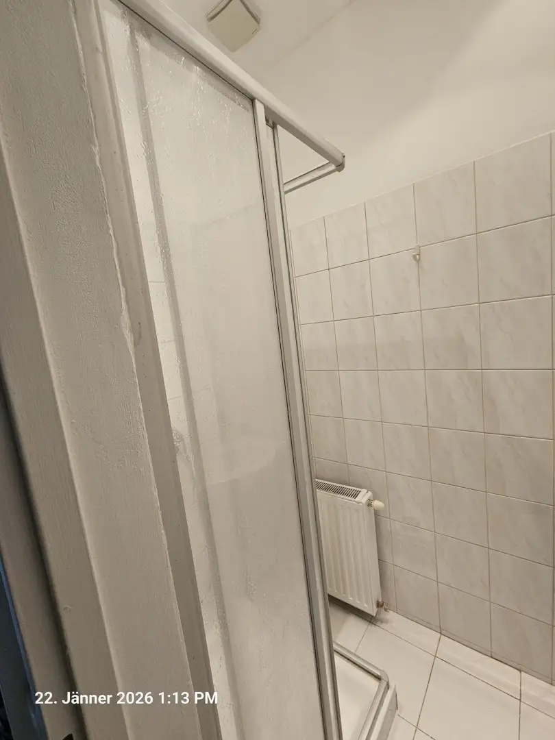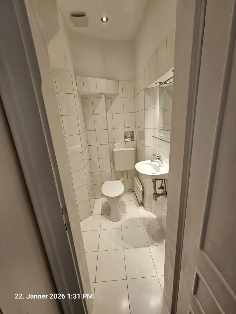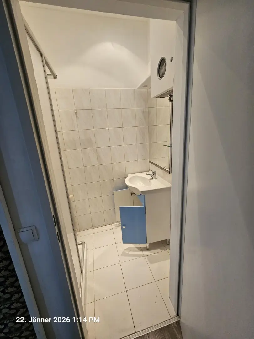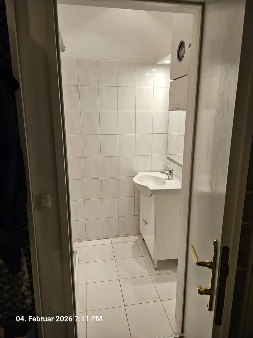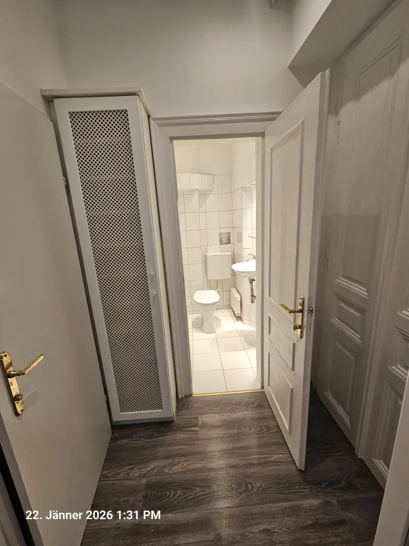 Vom Vorraum kommt man in das Duschbad, WC und Wohnzimmer.