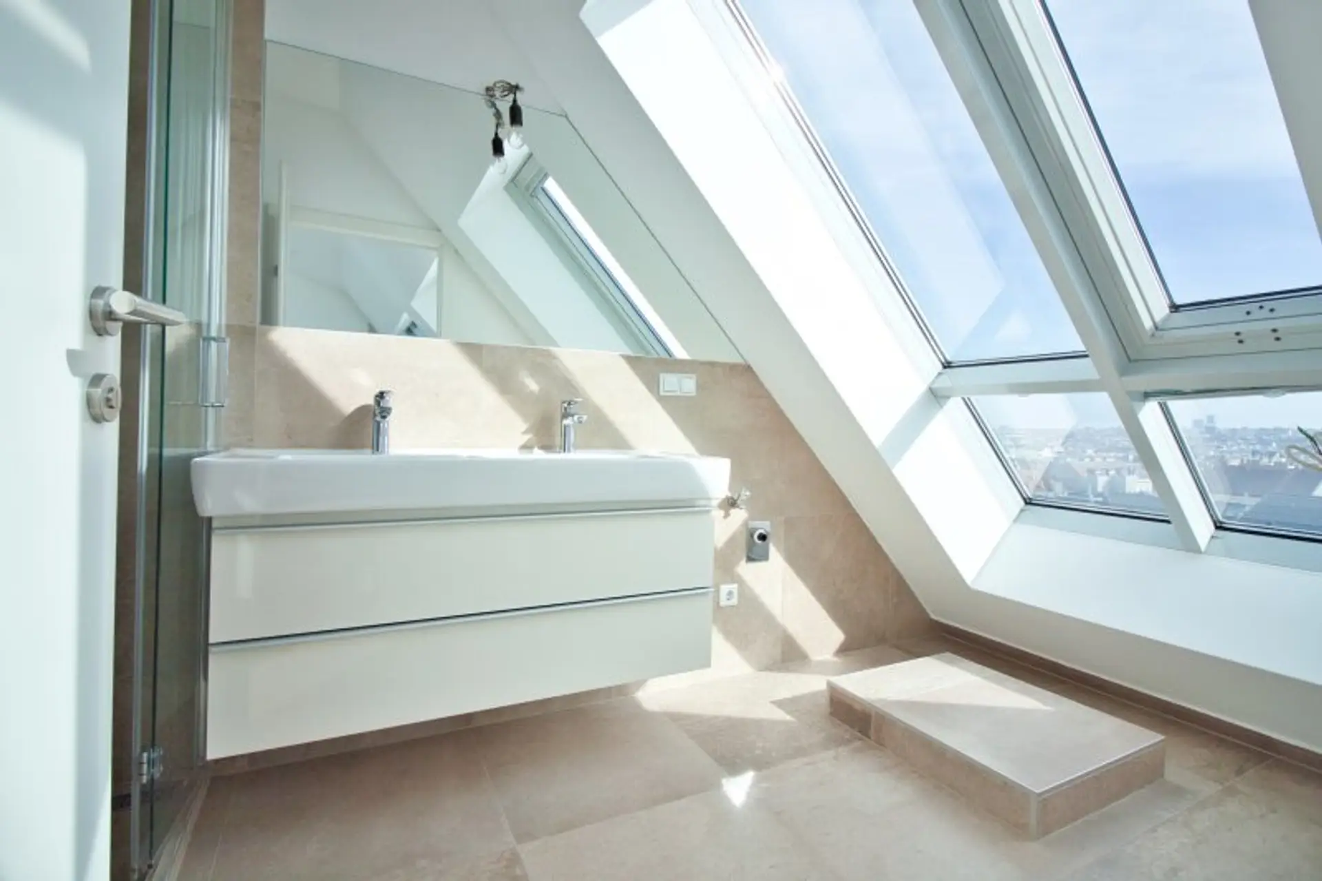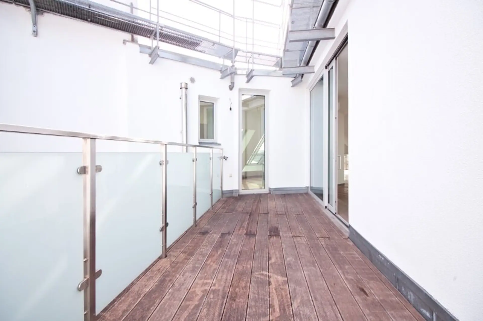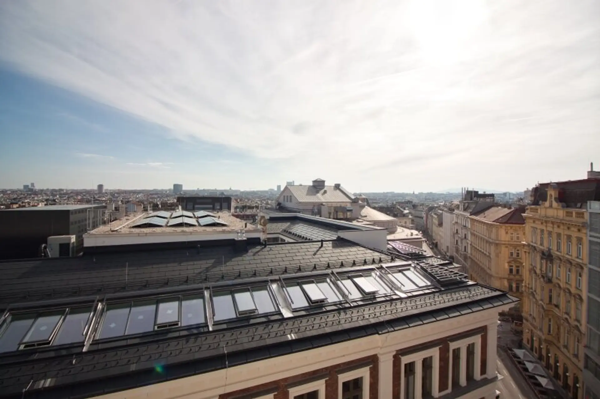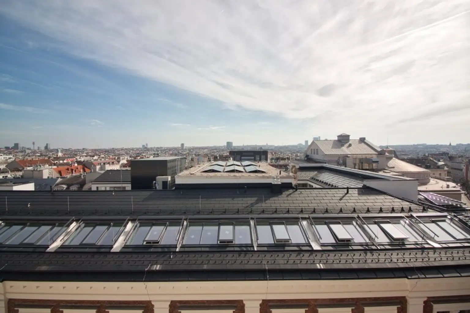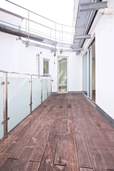 Die vom Wohnbereich begehbare ca. 14 m² große, östlich ausgerichtete Terrasse ist äußerst privat und lädt zu angenehmen Stunden über den Dächern von Wien ein.