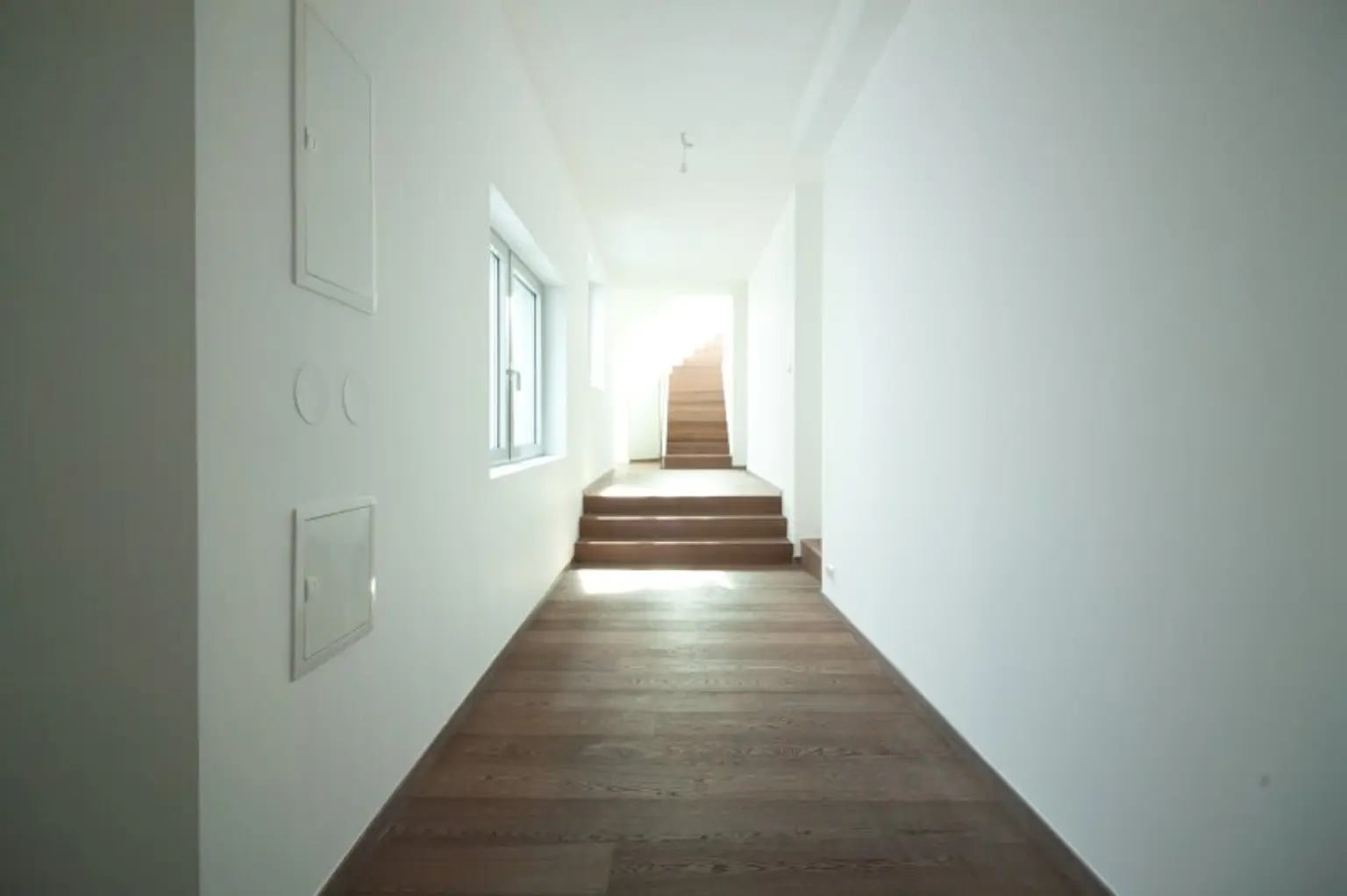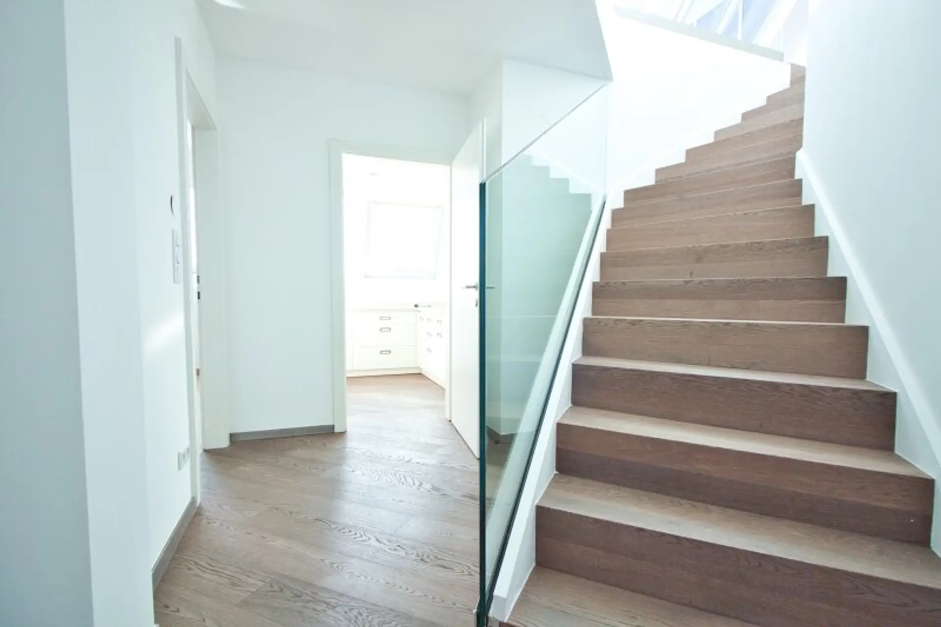 Vom Vorraum aus führt ein moderner, verglaster Aufgang in die lichtdurchflutete, obere Ebene: