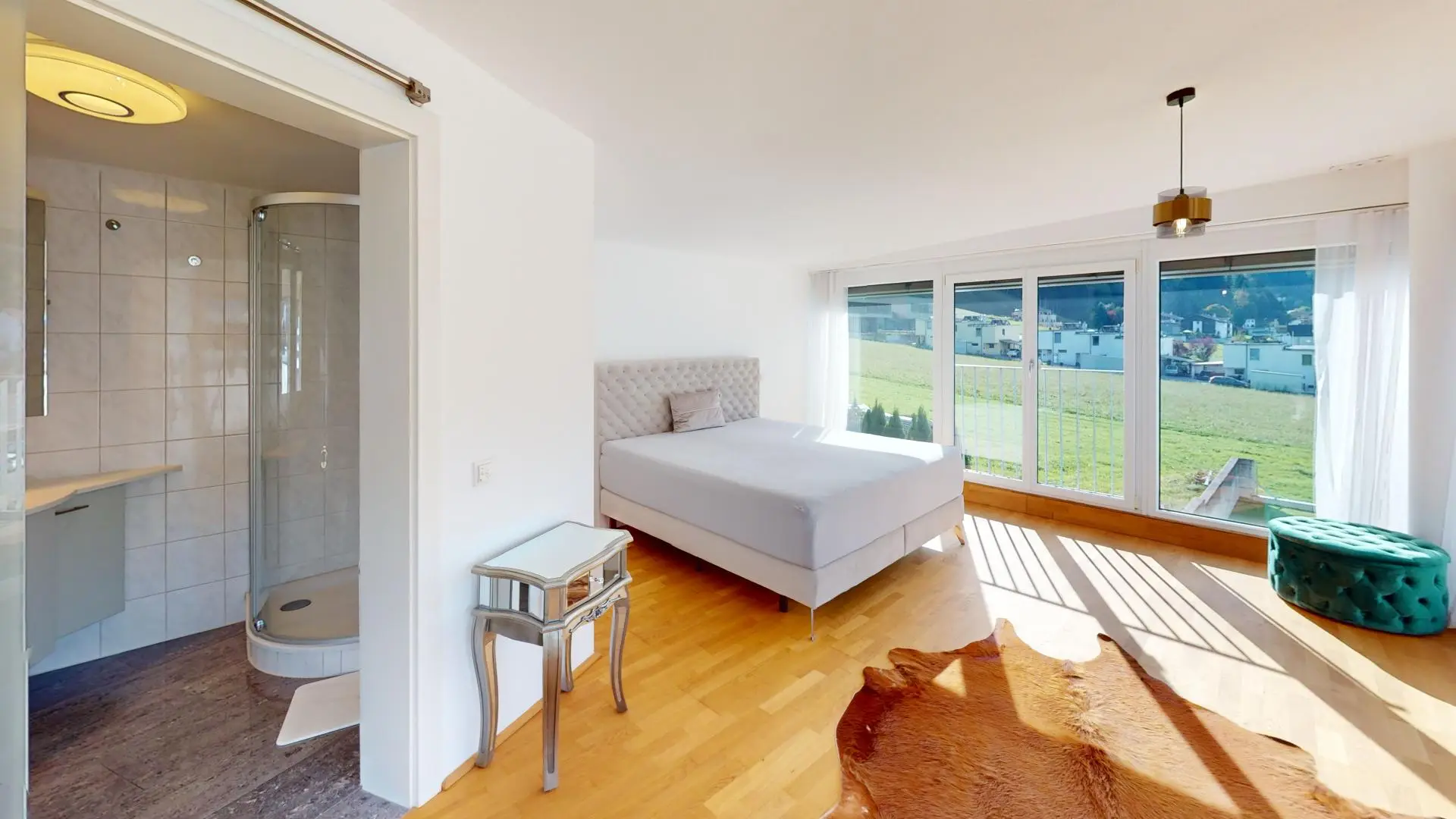 - Dachgeschoss: Großzügiges, helles Hauptschlafzimmer mit Bad „en suite“ und Zugang zur Dachterrasse (ca. 19 m²) mit herrlichem Ausblick