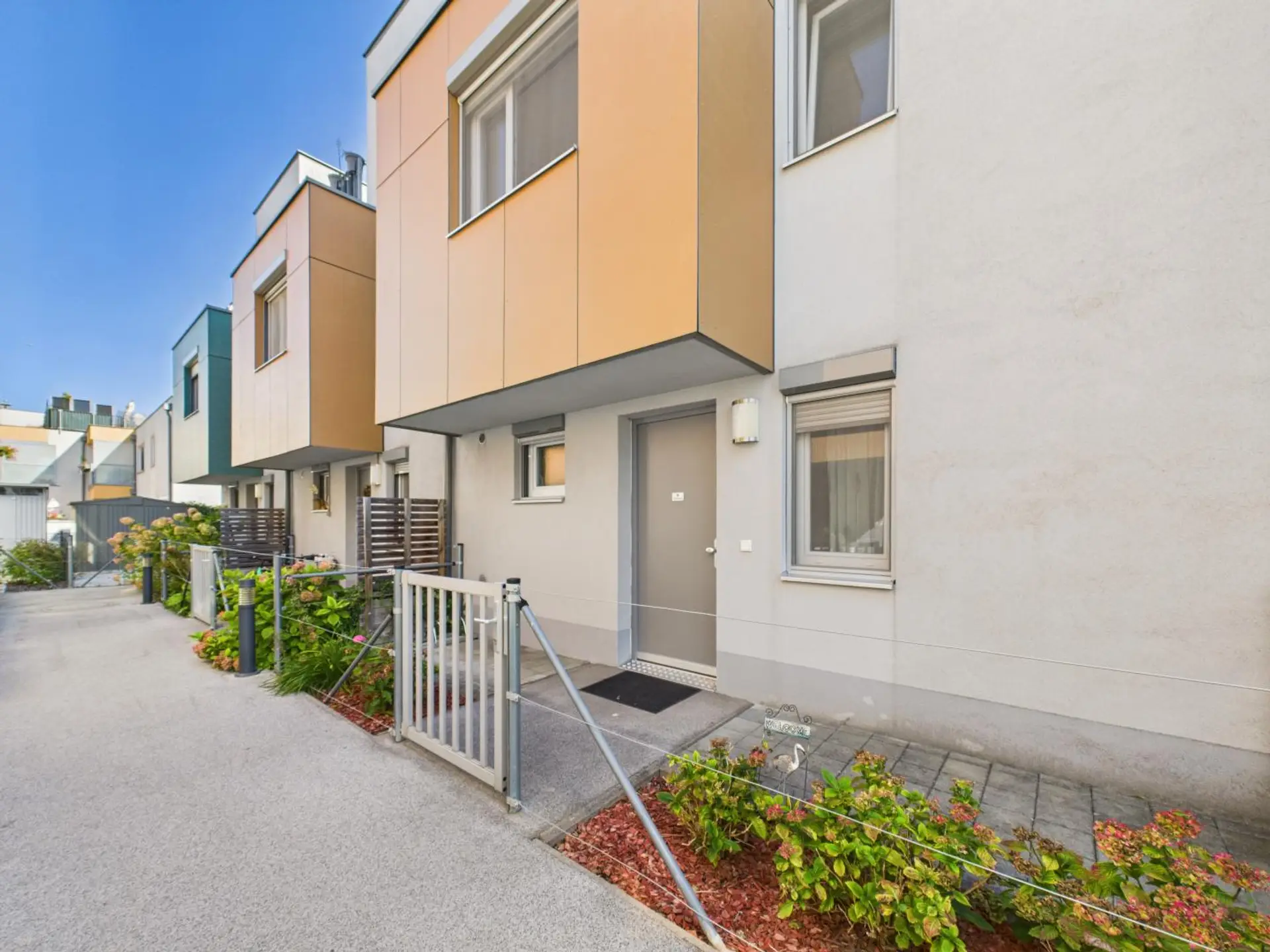 Das Reihenhaus befindet sich in der Mühlhäufelgasse, 1220 Wien – in einer ruhigen, familienfreundlichen Wohnanlage nahe dem Naturschutzgebiet Lobau. Hier genießen Sie Natur pur, ohne auf die Vorzüge der Stadt verzichten zu müssen.