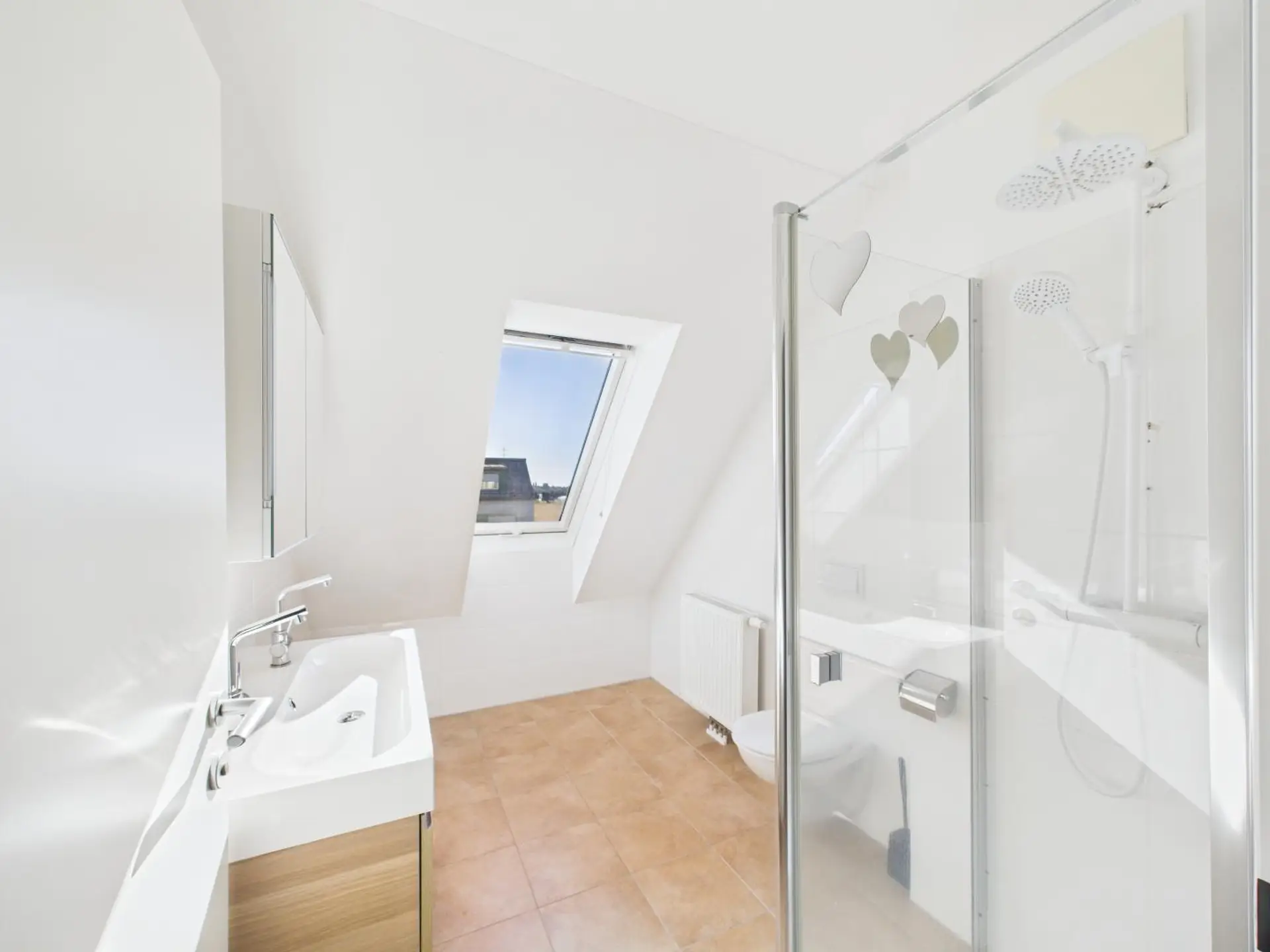 Modernes Badezimmer mit WC, Dusche und Dachschrägenfenster für spektakulären Lichteinfall