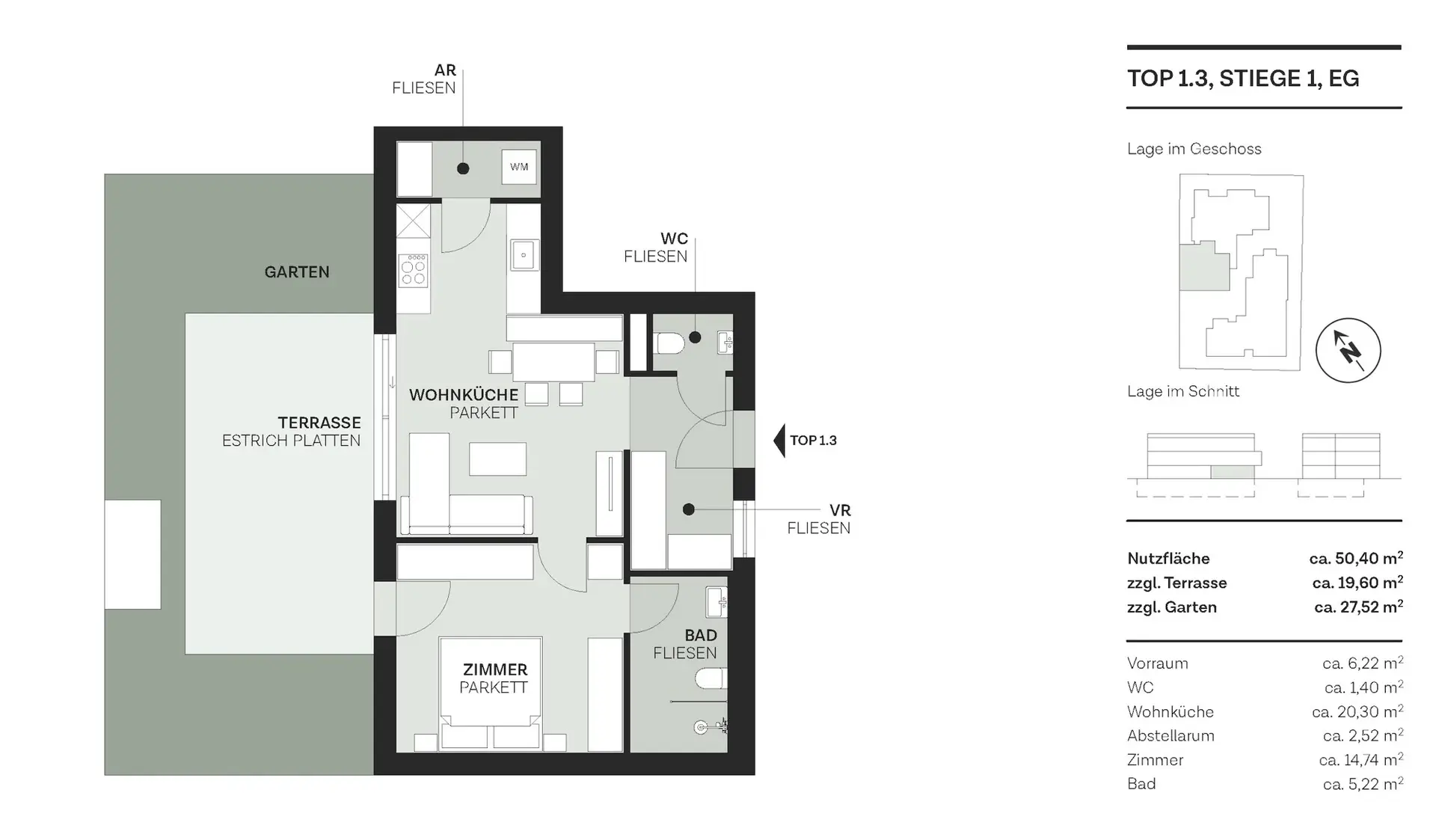 Ausstattung: Fahrstuhl Bad Fahrradraum Fußbodenheizung Terrasse Garten