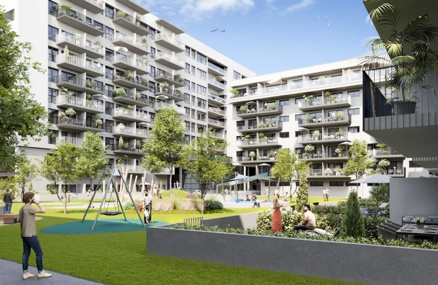 Die Erdgeschosszone besteht aus großzügigen Grünflächen und möblierten „Wohnstraßen“, die alle Bewohner:innen in ihrem Zuhause zum Entspannen einladen. Im östlichen Abschnitt des Grundstücks wird ein öffentlich zugänglicher Park angelegt.