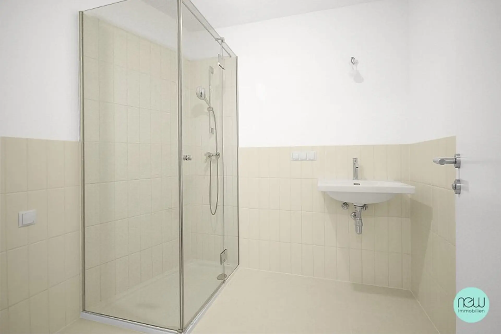 - Bad mit Dusche, Waschbecken, Handtuchtrockner und Waschmaschinenanschluss