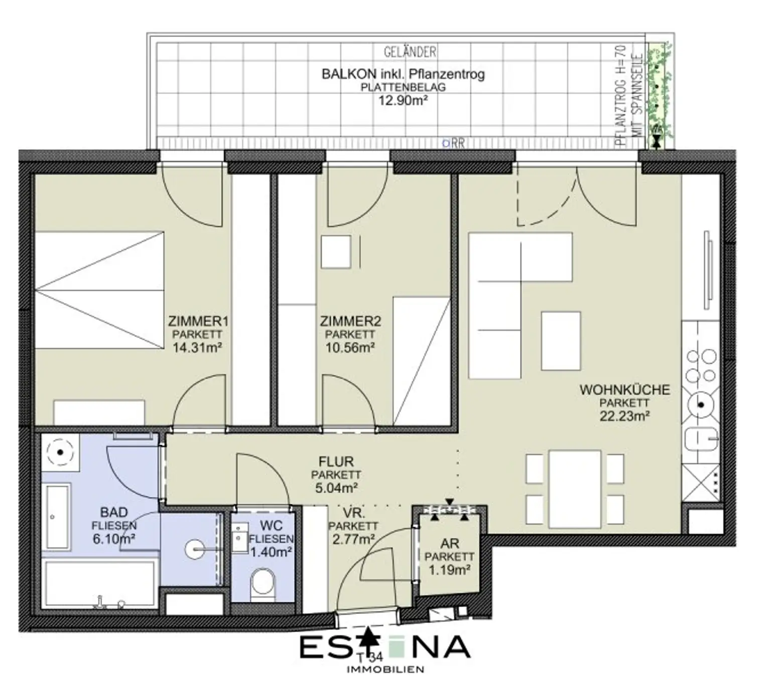 - 2 Schlafzimmer mit Zugang zum Balkon
