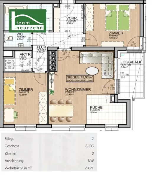 Die 3-Zimmer-Wohnung mit ca. 73,91 m2 Wohnfläche und ca. 5,64 m² Loggia/Balkon verfügt über folgende Raumaufteilung: