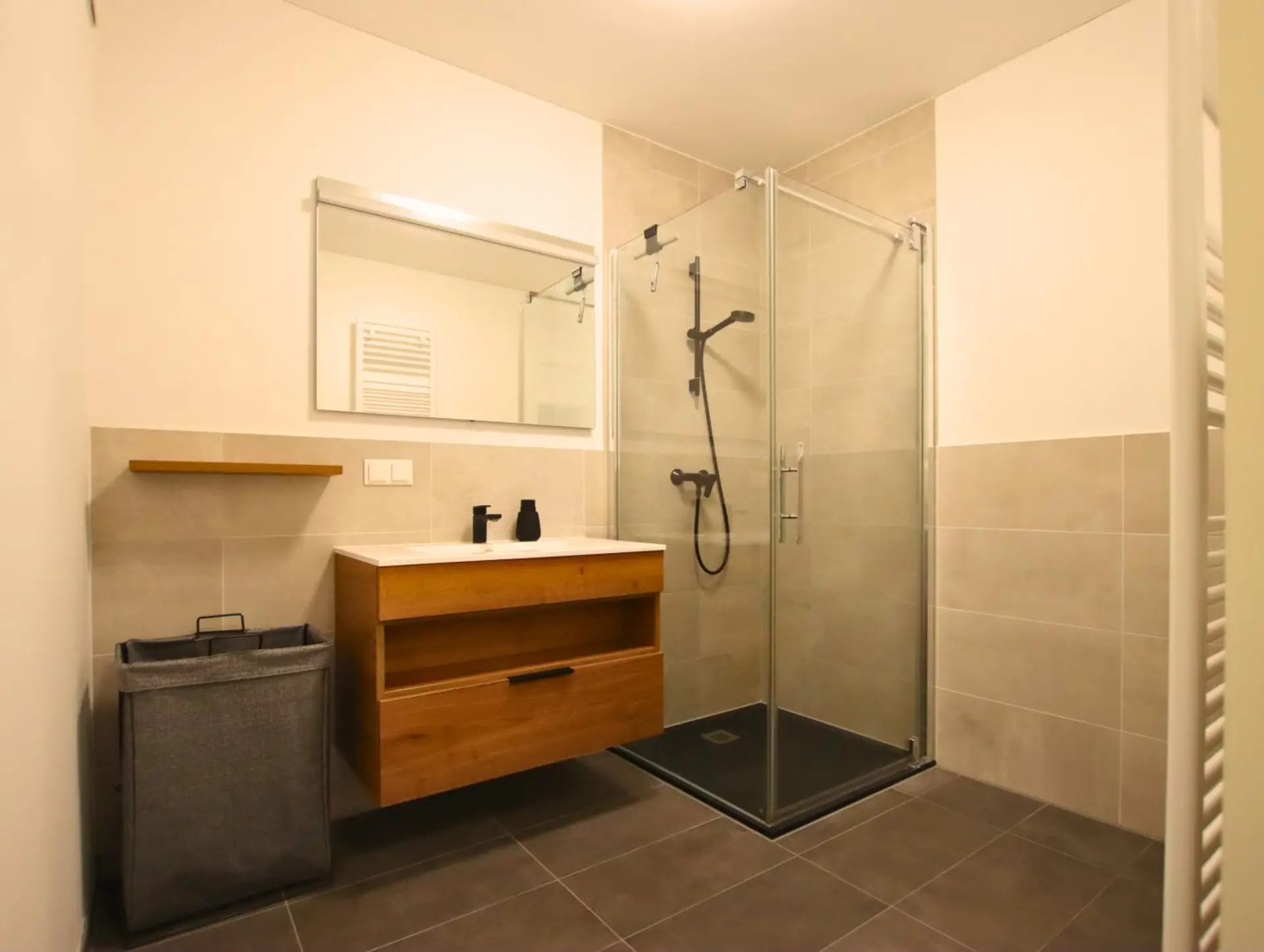 Im Wohnbereich ist ein hochwertiger Parkettboden ausgelegt. Die angebundene moderne Einbauküche mit Markengeräten in eleganter Optik rundet den Wohnraum perfekt ab. Das Badezimmer, die Wellness-Oase mit bodengleicher Walk-In-Dusche, edlem Holz-Waschtisch und einem großen Handtuchheizkörper. Ein Rückzugsort mit Ruhegarantie und viel natürlichem Licht findet man im Schlafzimmer.