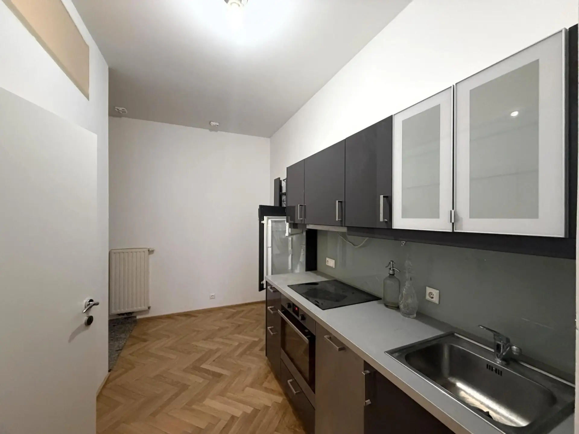 Zur Ausstattung der Wohnung gehört die Küche mit Kühl- und Tiefkühlfach, Fischgrät-Eichenparkettböden im gesamten Wohnbereich, einhließlich im Eingang und Essküche, Wand- und Bodenfliesen im Badezimmer sowie überall funktionierende Leuchtkörper, so wie abgebildet.