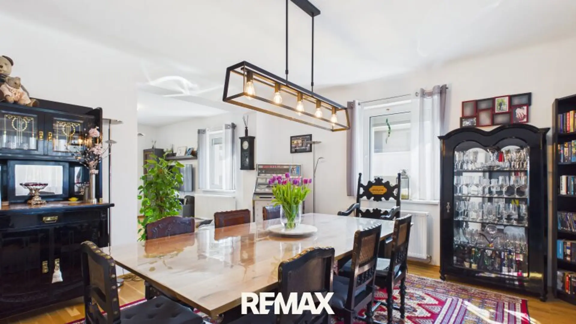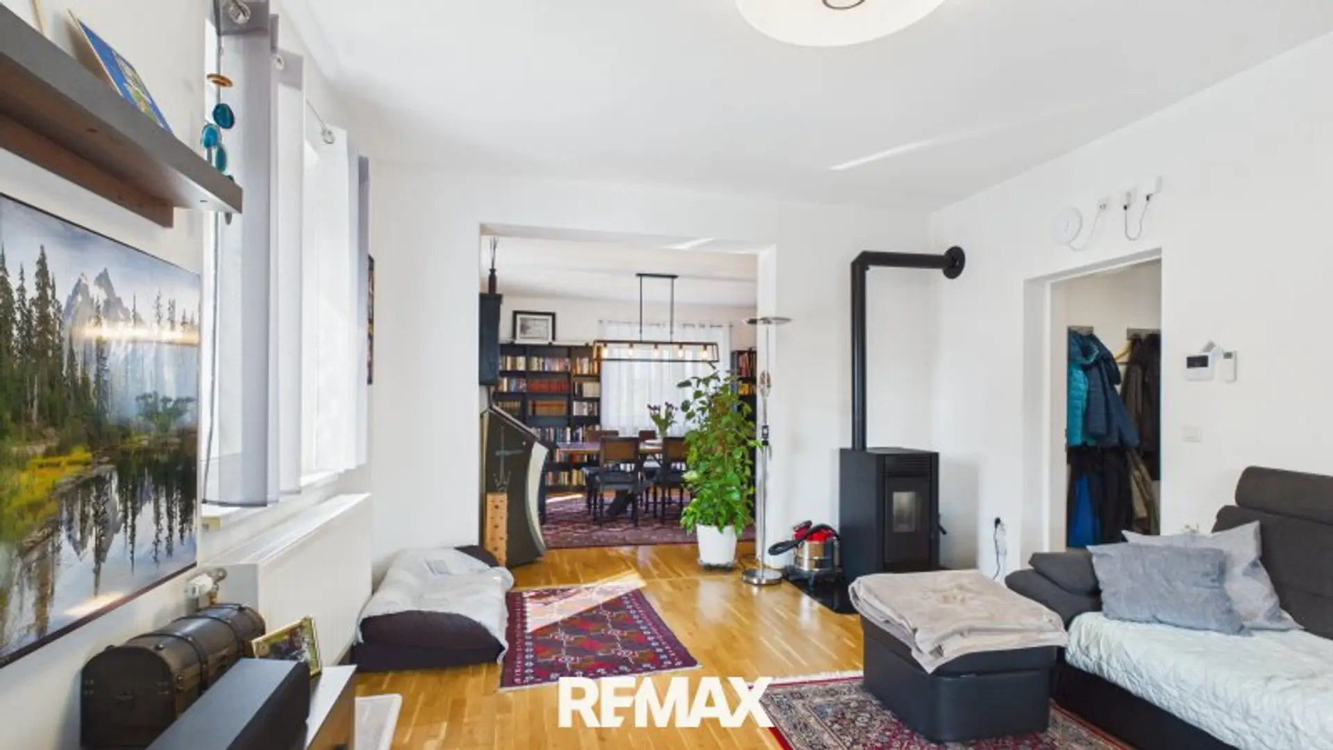 Das Esszimmer sowie das helle Wohnzimmer bieten viel Platz für die ganze Familie. Ein zusätzlicher Pelletsofen sorgt hier für angenehme Wärme und eine behagliche Wohnatmosphäre. Vom Wohnzimmer aus gelangt man direkt auf die überdachte Terrasse mit schönem Blick in den Garten – ideal für entspannte Stunden im Freien.