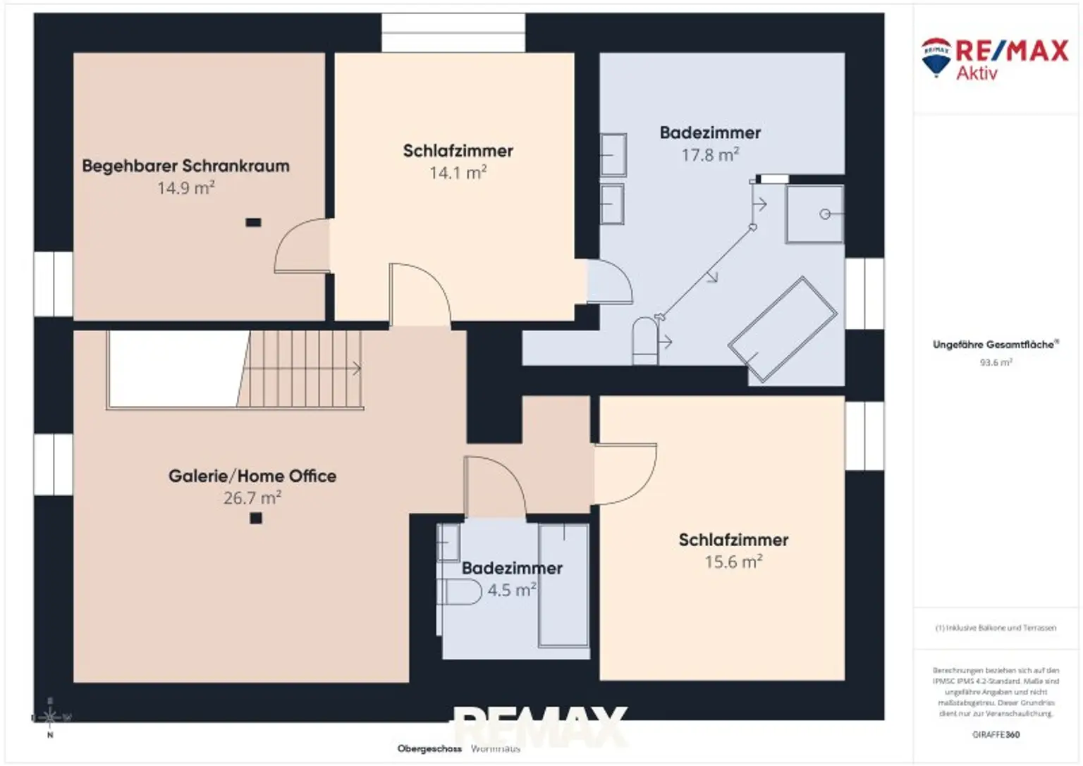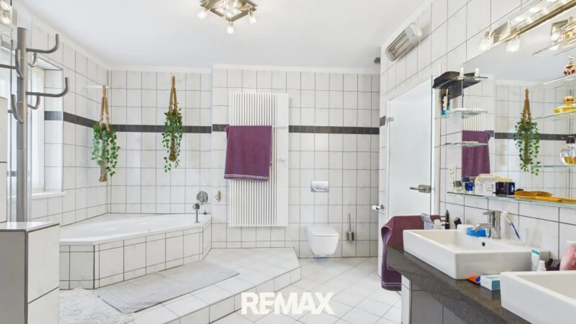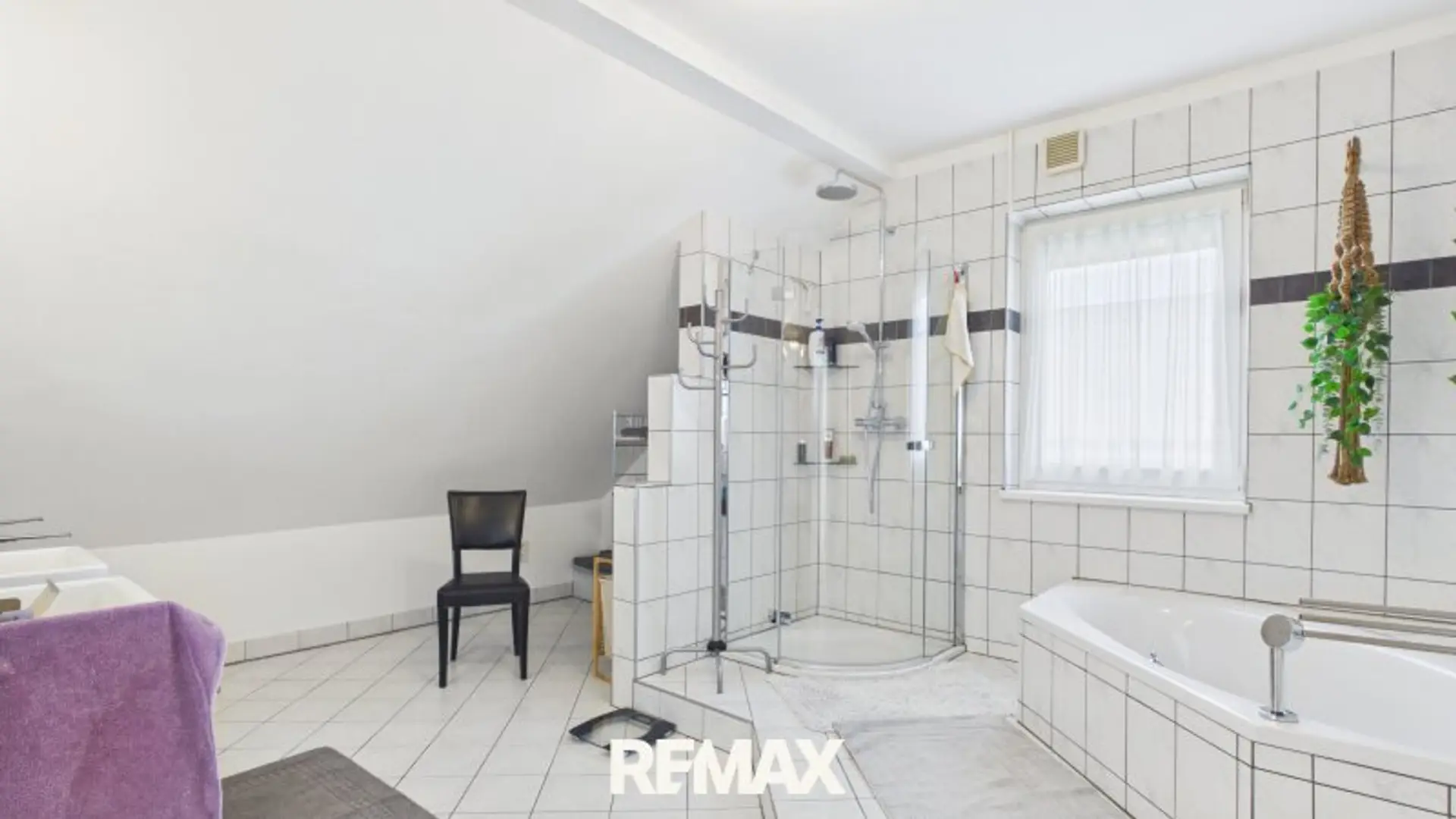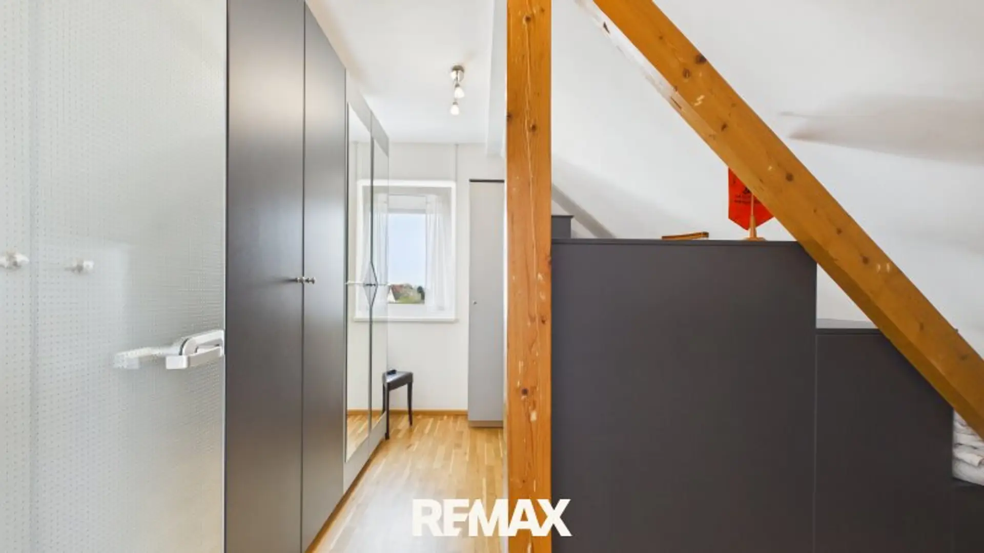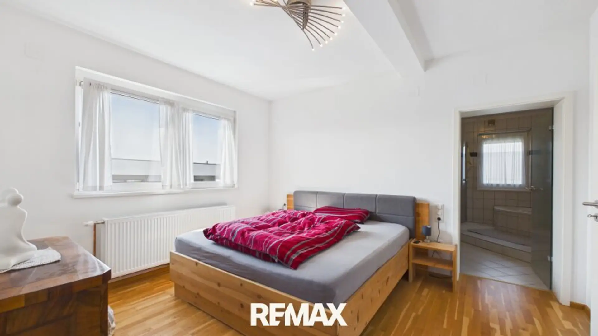 Über eine Treppe im Vorzimmer erreicht man das Obergeschoss. Dieses bietet eine offene Galerie, die aktuell als zweites Wohnzimmer bzw. Home-Office genutzt wird. Das Hauptschlafzimmer verfügt über ein eigenes Badezimmer mit Badewanne, Dusche, Doppelwaschbecken und WC sowie über einen begehbaren Schrankraum, der bei Bedarf auch als zusätzliches Kinder- oder Arbeitszimmer genutzt werden kann. Ein weiteres Schlafzimmer punktet ebenfalls mit einem eigenen Badezimmer und rundet das Raumangebot im Obergeschoss ab.