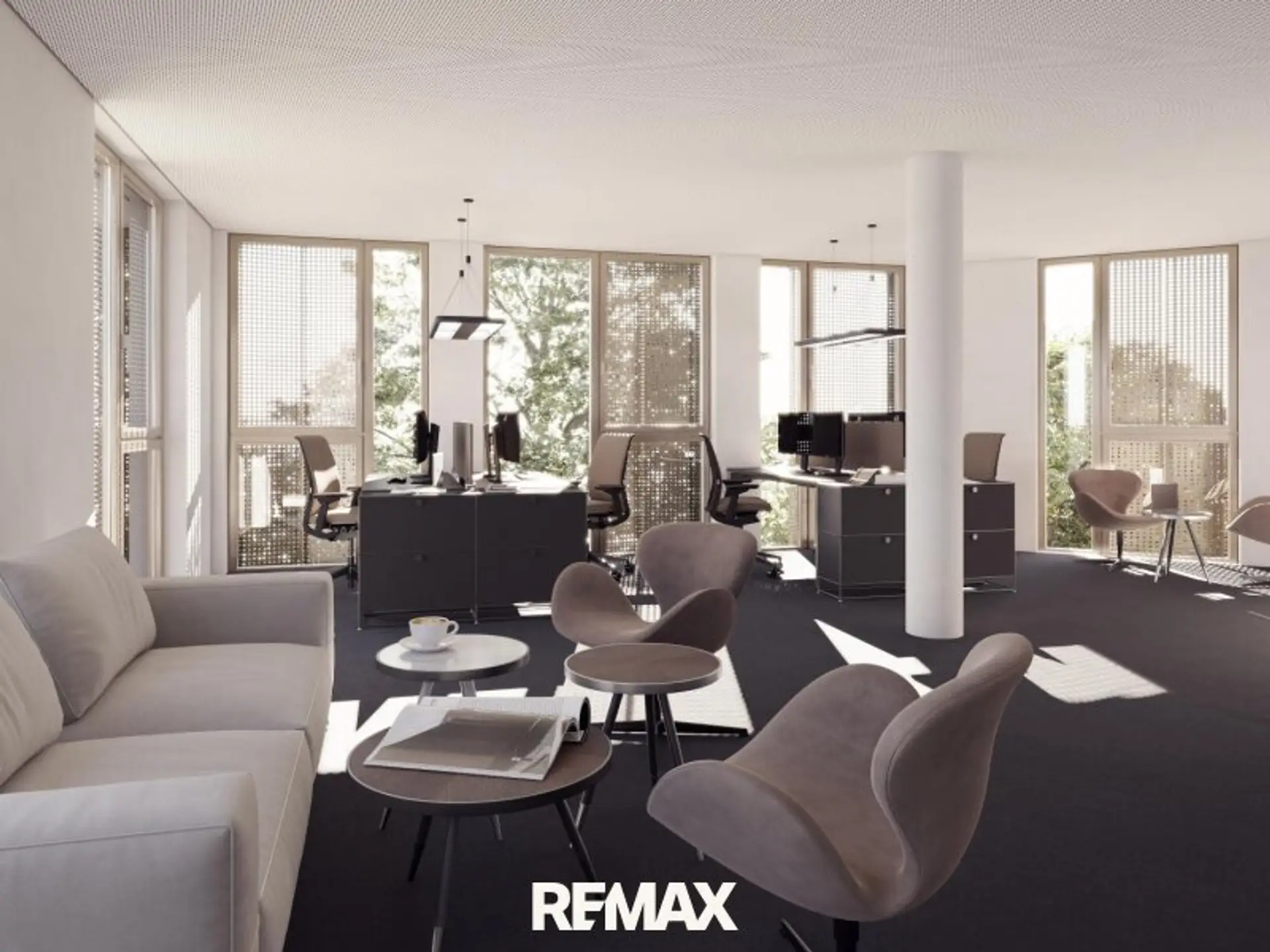 Sonnenschutz, teilweise durch Lochblech-Fassade oder Raffstore