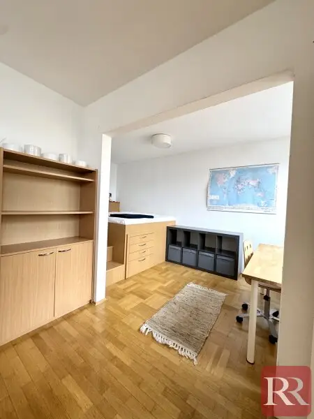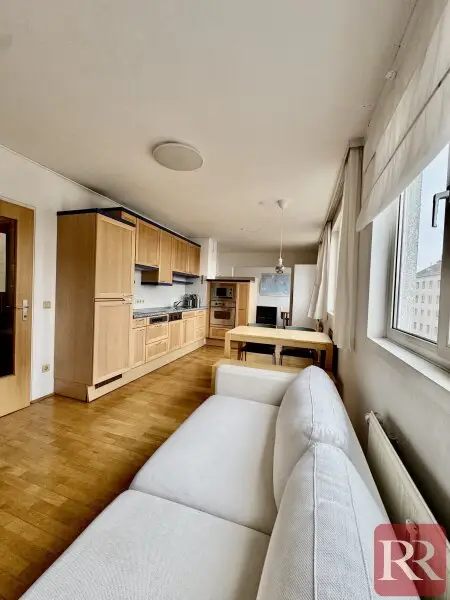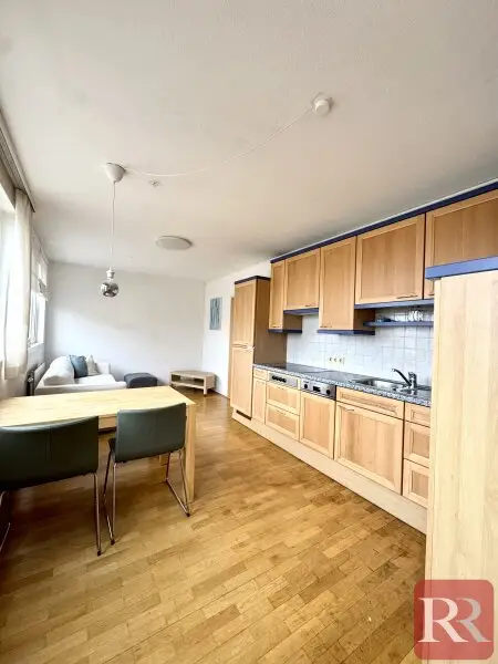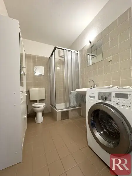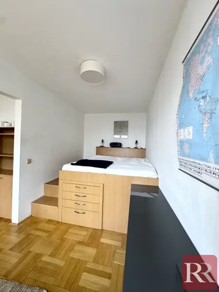 Die Wohnung verfügt über eine Wohnfläche von ca. 43,68 m² und bietet eine funktionale sowie gut durchdachte Raumaufteilung. Vom Vorraum aus sind sämtliche Bereiche zentral begehbar. Direkt vom Vorraum gelangt man in das Badezimmer mit Dusche, WC und Waschmaschine mit Trockner sowie in den praktischen Abstellraum. Ebenfalls vom Vorraum aus erreicht man den großzügigen, hellen Wohn- und Küchenbereich. Im hinteren Bereich der Wohnküche befindet sich der offen gestaltete Schlafbereich mit eingebautem Doppelbett und zusätzlichem Stauraum, der durch eine rechteckige Wandöffnung optisch abgetrennt ist. Durch die Fenster genießt man einen angenehmen Ausblick vom fünften Stock über den gegenüberliegenden kleinen Park.
