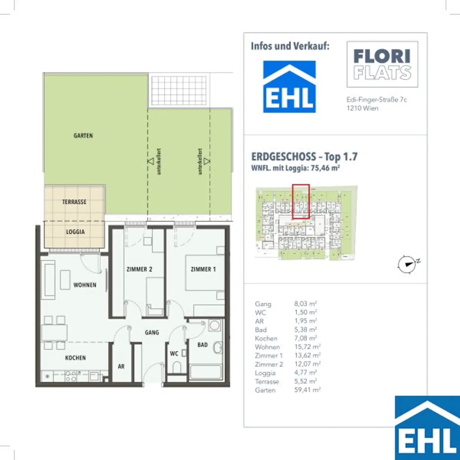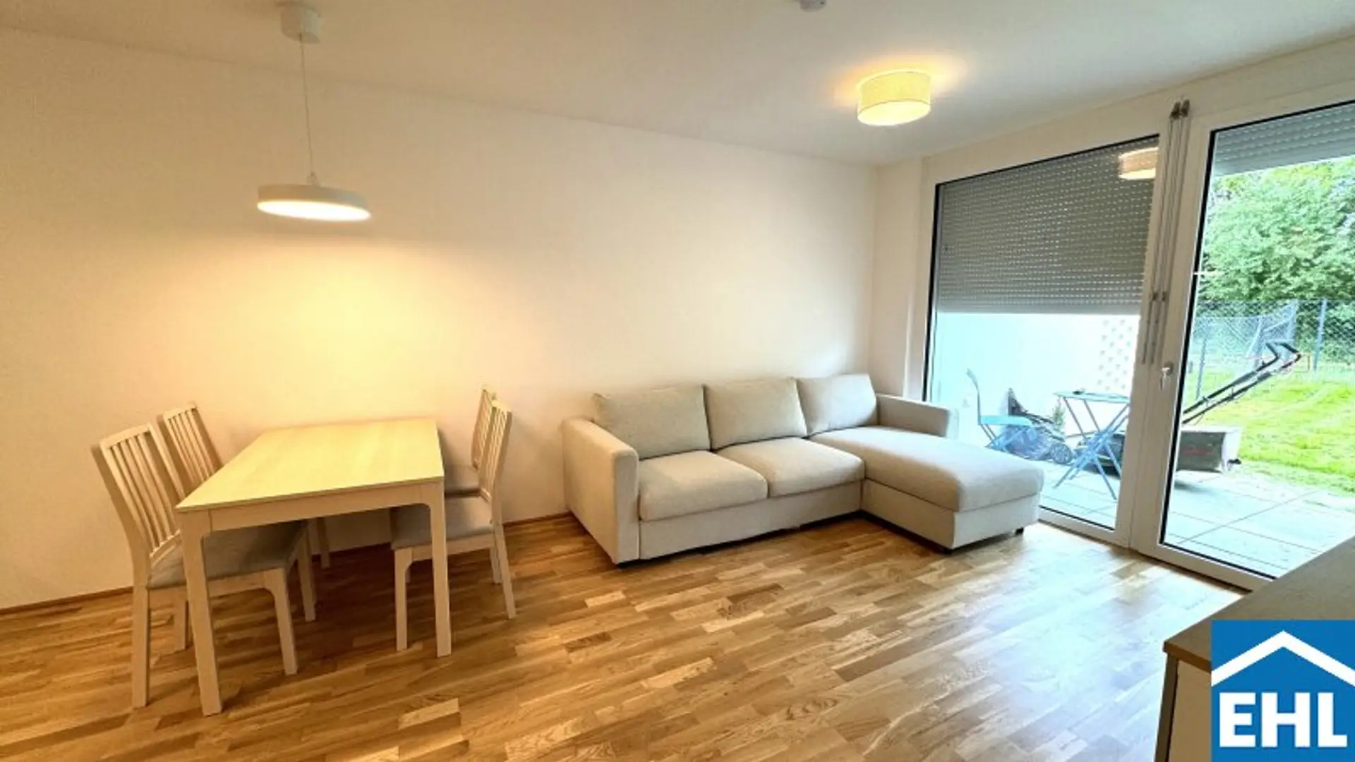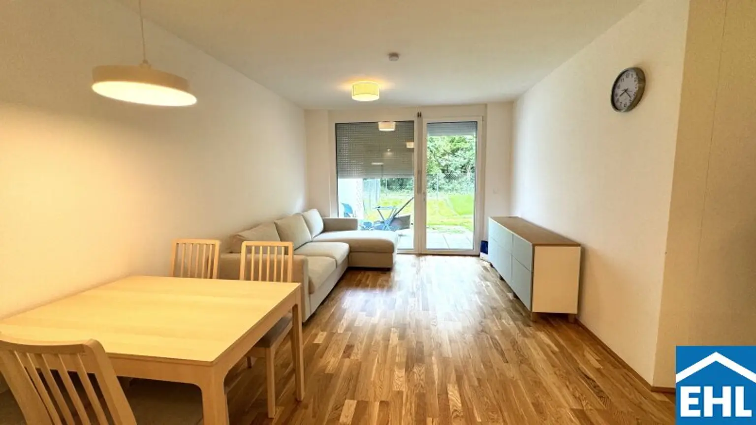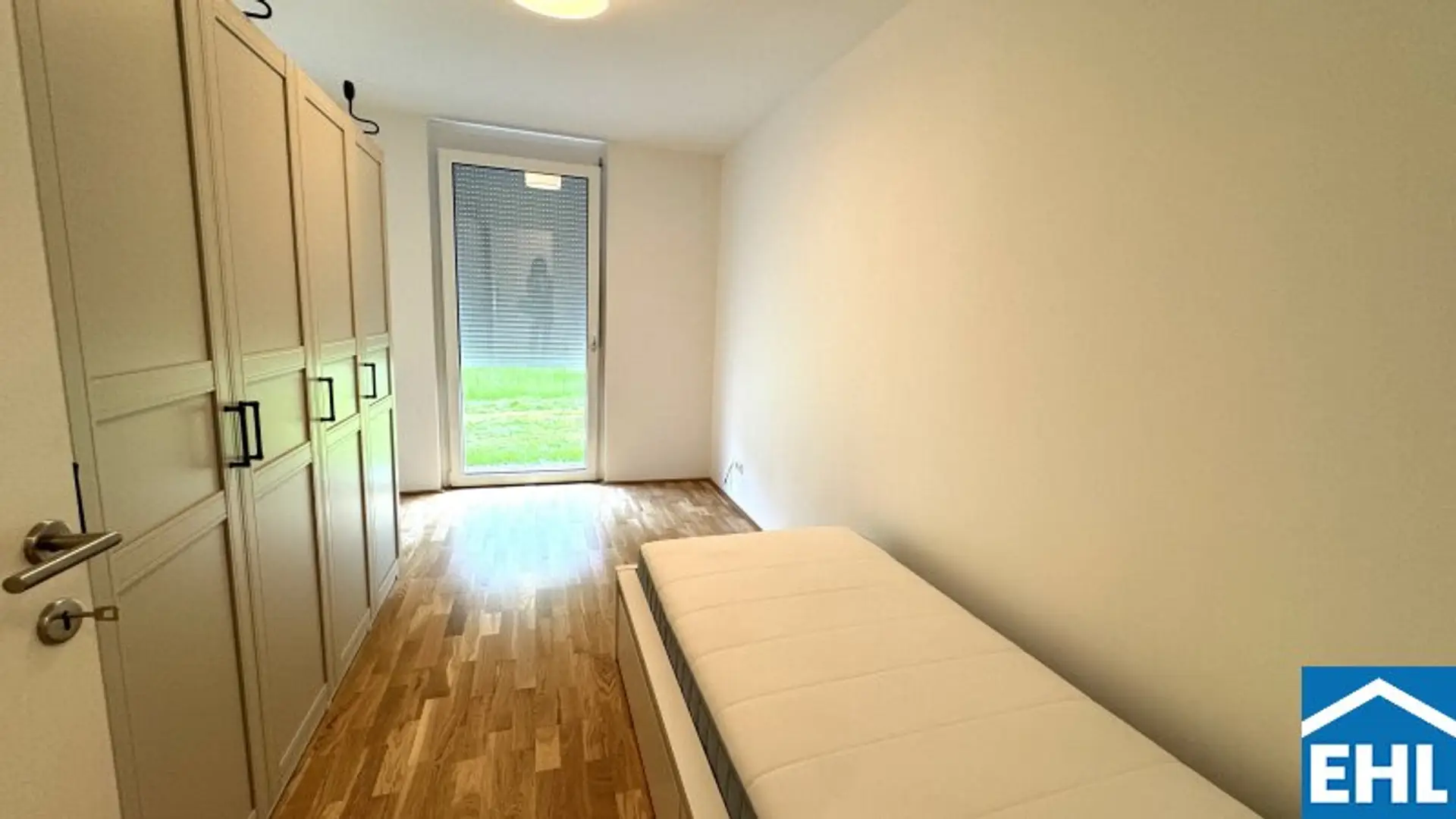 Die 3 Zimmerwohnung ist westseitig in Richtung eines wunderschönen Grüngürtels ausgerichtet und somit absolut ruhig gelegen. Sowohl von der Wohnküche, als auch von den beiden Schlafzimmern aus, gelangen Sie direkt in den Eigengarten, der weiters über eine teilweise überdachte Terrasse verfügt.
