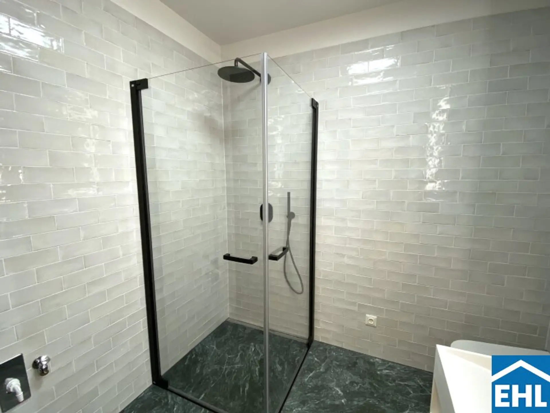* Badezimmer mit Dusche, Waschmaschinenanschluss und WC