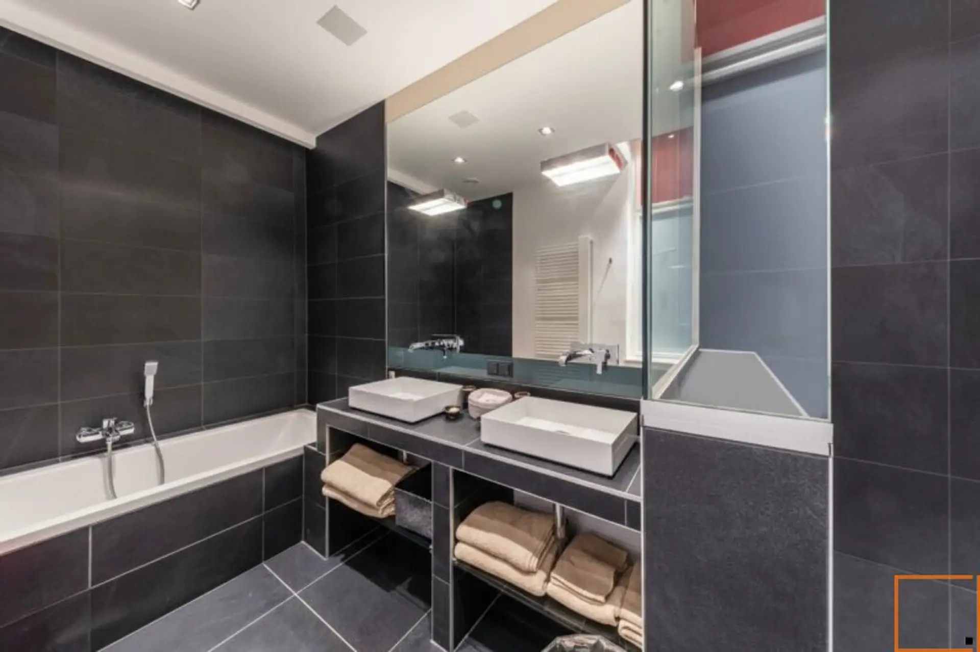 * großes Badezimmer: Badewanne, Dusche, Doppelwaschbecken, Handtuchheizkörper, Fenster