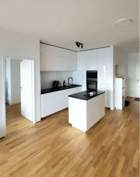 Es erwartet Sie ein Vorzimmer mit Garderobenbereich, abgesichert mit einer Sicherheitstür und Video-Interfon, sowie ein Wohnzimmer mit offener Küche und Kücheninsel, welche ist mit allen Geräte (Induktionsherd mit Herdplatte, Backoffen, Kühlschrank mit Gefrierfach, Geschirrspüler, Dunstabzug, etc.).