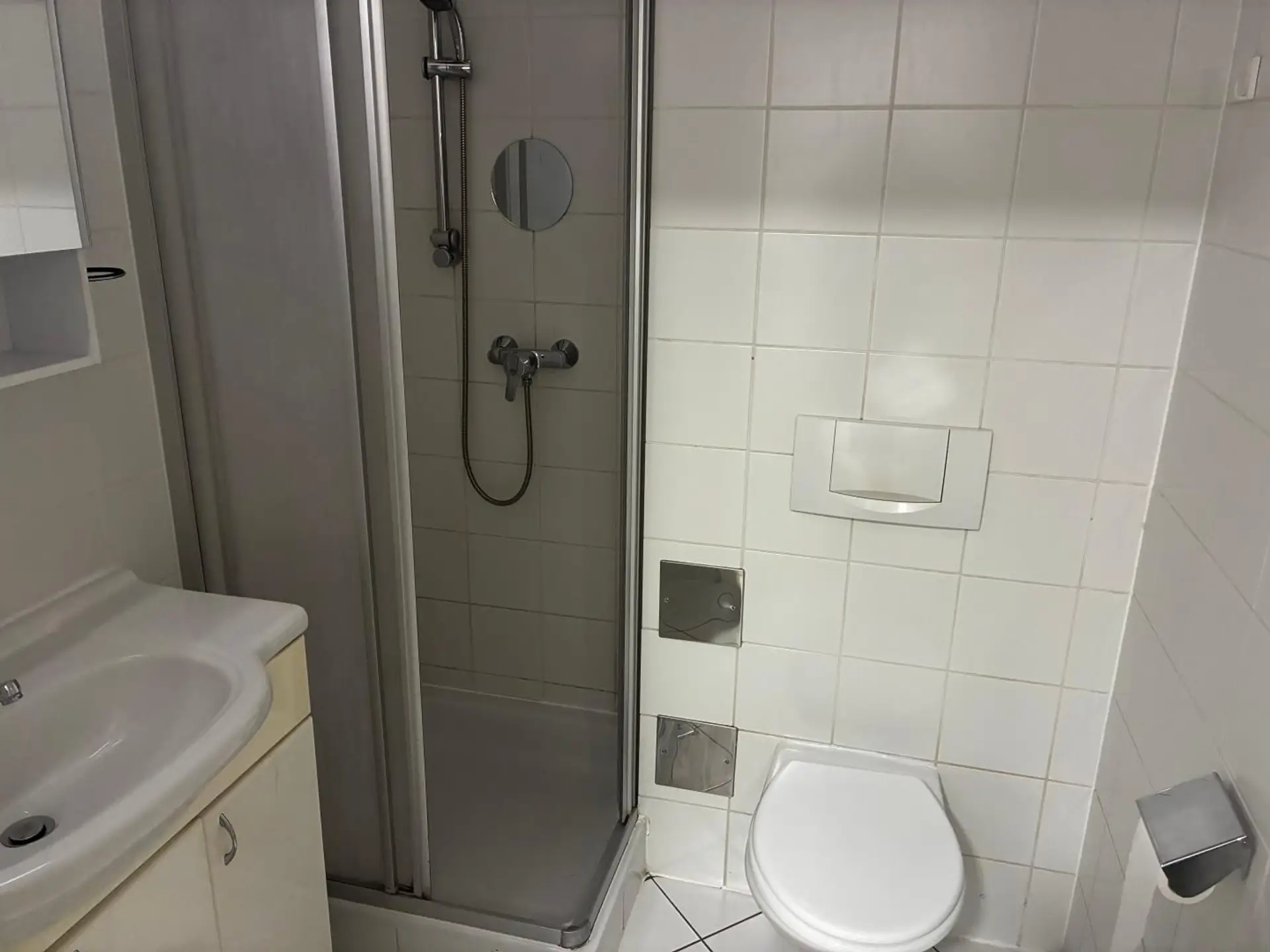 Badezimmer: Möbliert mit Dusche, WC, Waschbecken mit Verbau