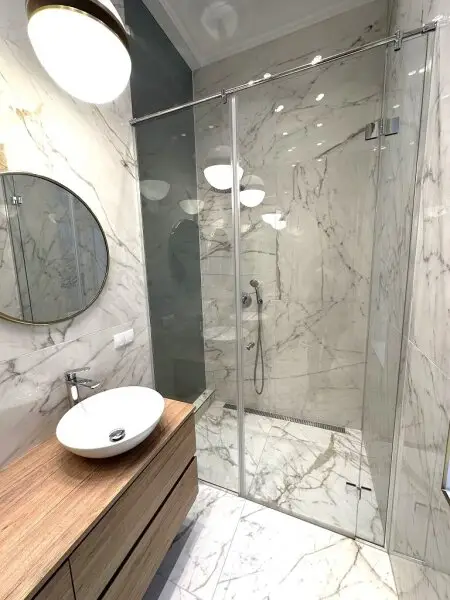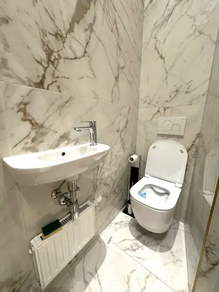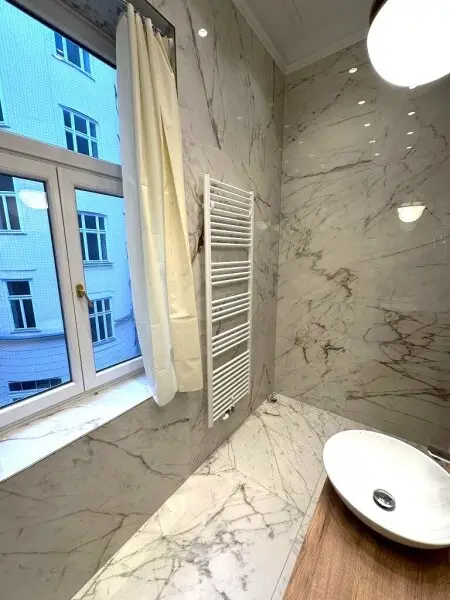 + 1 BADEZIMMER MIT DUSCHE, WASCHTISCH, FENSTER UND SPROSSENHEIZKÖRPER
